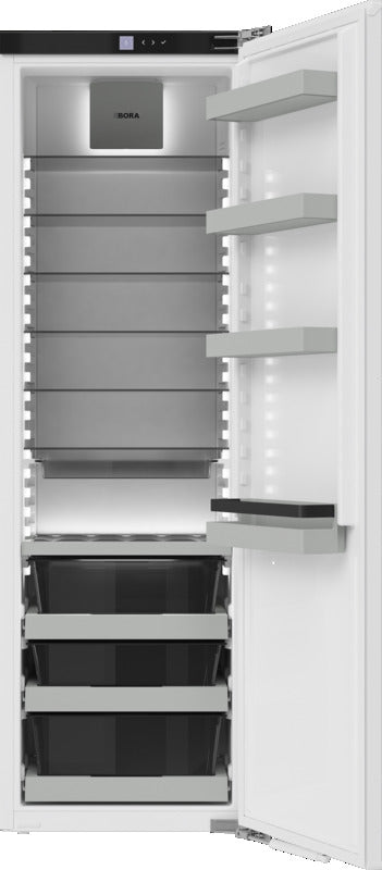 Możliwość ustawienia temperatury komory chłodziarki (od 3 °C do 9 °C) oraz funkcje Power Cool, Eco. 6x regulowane wysokościowo szklane półki, 3x półki na konserwy regulowane wysokościowo z matą silikonową, 3x wyjmowane szuflady BORA Fresh zero z półkami wysuwanymi i 2x pokrywą regulującą wilgotność. Dodatkowo, filtr zapachów, osłona wentylatora, sucha tylna ściana komory chłodziarki, szuflady z parą oraz wielopoziomowe oświetlenie LED. Alarm otwarcia drzwi oraz przypomnienie o wymianie filtra.