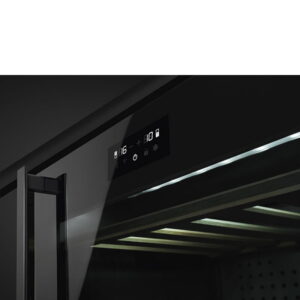Winiarka, wysokość: 82 cm, sterowanie dotykowe, pojemność: 38 butelek, Wi-Fi, otwieranie push-pull, 2 półki stałe + 3 demontowalne, elektroniczne sterowanie temperaturą (5°-20°C), oświetlenie LED, drzwi ze szkłem z powłoką anty-UV, klasa efektywności energetycznej G, pojemność netto: 114 l, zawias z prawej strony (brak możliwości zmiany kierunku otwierania drzwi)