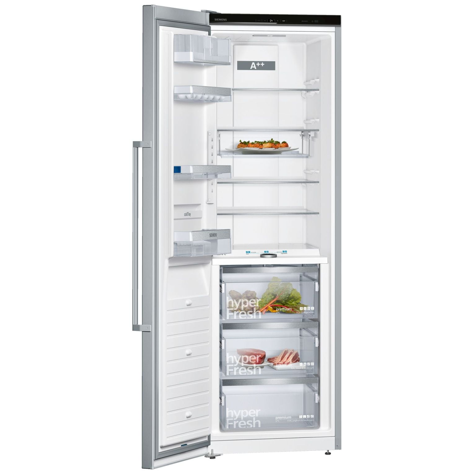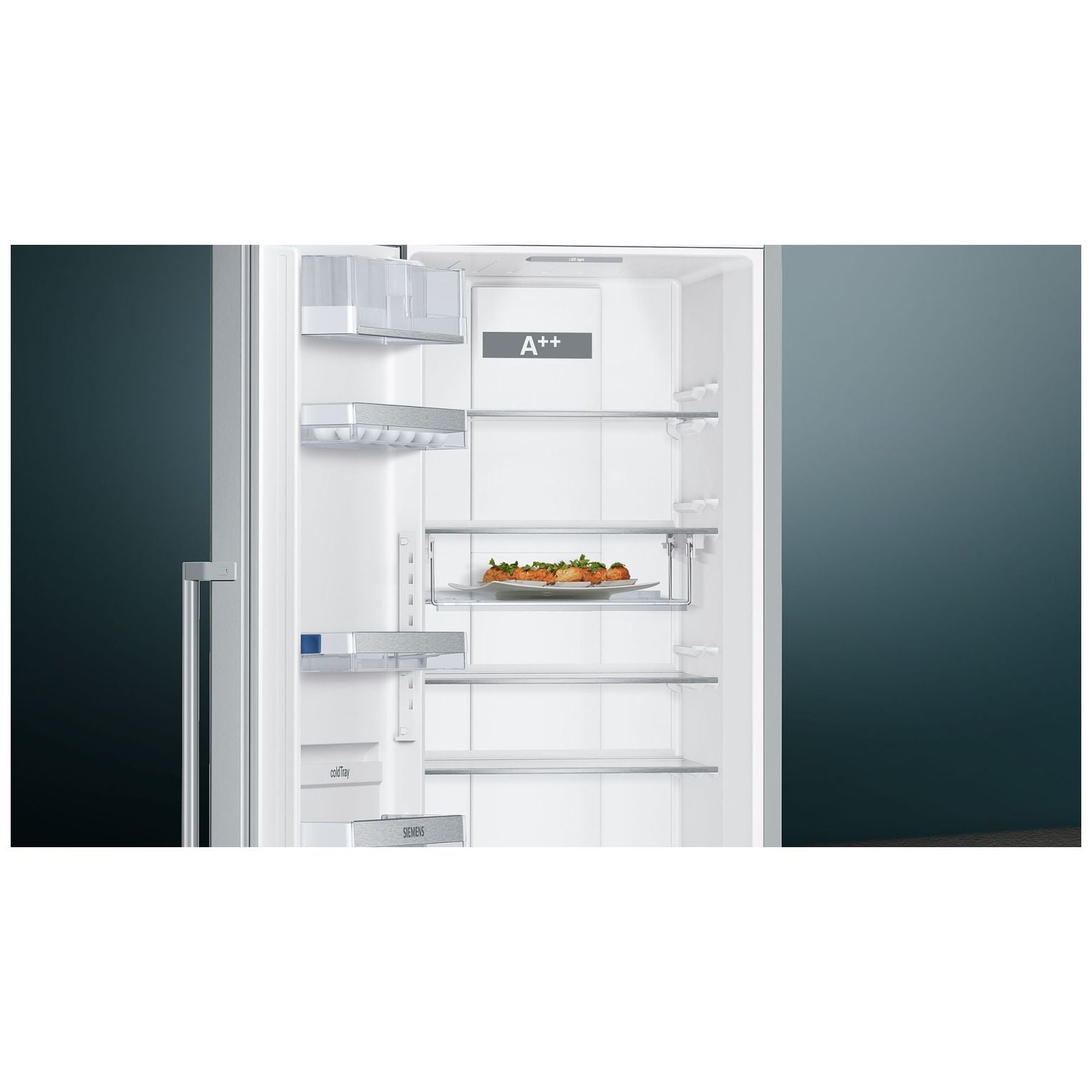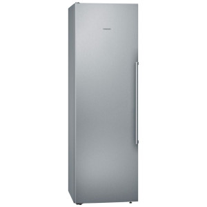 Funkcje i udogodnienia: noFrost, elektroniczna regulacja temperatury, wyświetlacz cyfrowy touchControl, 5 szklanych półek, wentylator-dynamiczne chłodzenie, strefa świeżości vitaFresh premium 0°C – 2 szuflady na mięso i ryby, 1 szuflada na warzywa i owoce z regulacją wilgotności, oświetlenie LED, zamykana półka na drzwiach na masło/sery, automatyczne odszranianie, superchłodzenie, kolor: drzwi stal szlachetna, powłoka antiFingerprint na drzwiach. Możliwość kombinacji z zamrażarką GS36NAI3P.