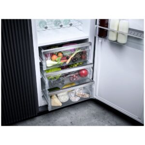 Wnętrze lodówki oferuje całkowitą pojemność użytkową 294 l z czego komora PerfectFresh Pro o pojemności 98 l utrzymuje owoce i warzywa świeże do pięciu razy dłużej dzięki precyzyjnej kontroli temperatury i wilgotności. Organizacja przestrzeni jest ułatwiona dzięki 6 półkom w tym jednej dzielonej FlexiBoard która elastycznie dostosowuje się do wysokich naczyń. Urządzenie dysponuje również 3 szufladami świeżości półką na butelki z chromowanego metalu oraz wieloma półkami w drzwiach (dwie na konserwy dwie na butelki i cztery ogólne) zapewniając porządek. Elementy takie jak półki ComfortClean można wygodnie czyścić co ułatwia utrzymanie higieny.