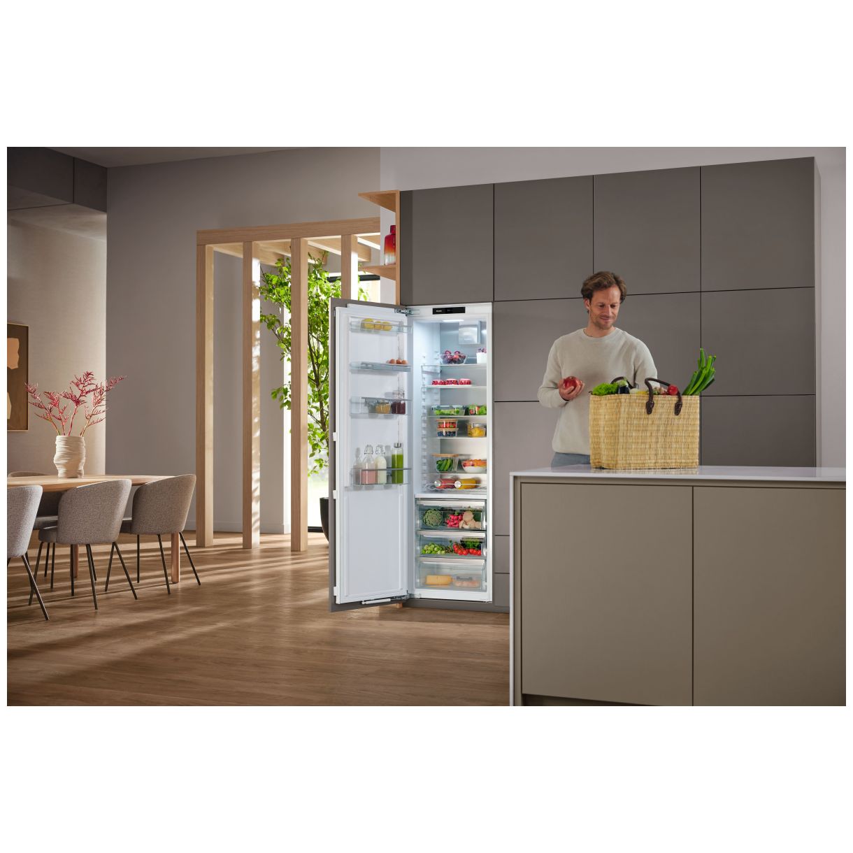 Prezentujemy lodówkę do zabudowy Miele model 12361920 z serii K 7747 C. Urządzenie o wysokości 1772 mm szerokości 559 mm i głębokości 546 mm idealnie integruje się z niszą do zabudowy o wysokości 178 cm zapewniając estetyczne wkomponowanie oraz elastyczność montażu.