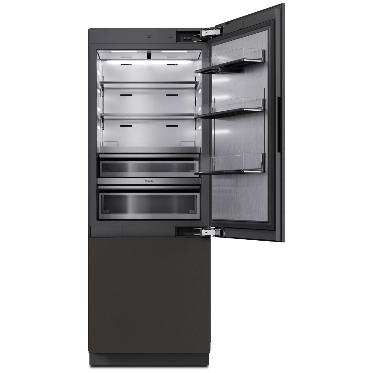 Mechanizm Push2open otwiera drzwi po naciśnięciu frontu ułatwiając integrację z kuchniami bez uchwytów. Zawiasy MaxLoad obsługują ciężkie panele a systemy SoftClose i SelfClose zapewniają delikatne i automatyczne domykanie drzwi. Wnętrze oświetla BrilliantLight Pro.