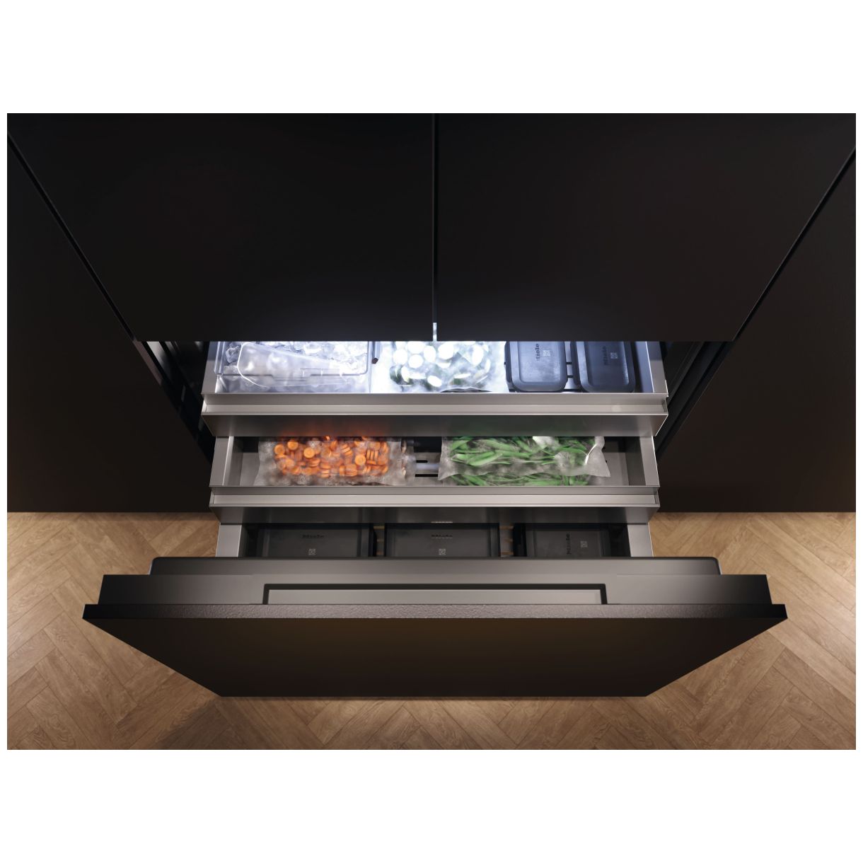 Całkowita pojemność użytkowa 576 l jest funkcjonalnie podzielona. Komora chłodzenia o pojemności 379 l zawiera dedykowane 60 l strefy Perfectfresh 1 przestawianą półkę szklaną na całą szerokość 2 półki na połowę szerokości 1 pojemnik VeggieBox oraz 2 szuflady świeżości MasterFresh Pro. Drzwi oferują 4 półki na konserwy i 2 półki na butelki. W komorze mrożenia o pojemności 197 l znajdują się 3 kosze z czego 2 na prowadnicach teleskopowych. Dodatkowy komfort zapewnia 1 IceMaker z dzienną produkcją 14 kg lodu. System EasyClean ułatwia utrzymanie higieny urządzenia.