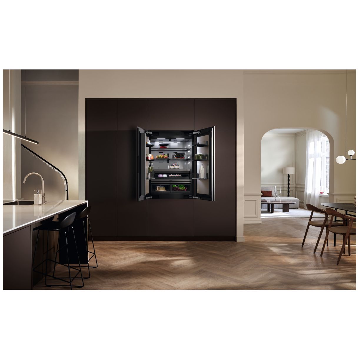Chłodziarko-zamrażarka do zabudowy zintegrowanej Miele MasterCool FrenchDoor KFMC 3844 FD (SKU: 12866750) doskonale integruje się z przestrzenią kuchenną. Urządzenie pasuje do wnęki o szerokości 914 mm wysokości 2134 mm i głębokości 610 mm gwarantując estetyczne zlicowanie z frontami meblowymi. Funkcja Push2open umożliwia otwarcie drzwi delikatnym naciśnięciem idealnie wpisując się w minimalistyczne aranżacje bezuchwytowe.