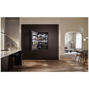 Miele prezentuje chłodziarko-zamrażarkę MasterCool KFMC 3844 L (SKU: 12866680) zaprojektowaną jako urządzenie do zabudowy zintegrowane. Z szerokością urządzenia 895 mm wysokością urządzenia 2123 mm i głębokością urządzenia 608 mm harmonijnie integruje się z zabudową meblową. Zawiasy drzwi standardowo umieszczone są po lewej stronie z możliwością zmiany kierunku otwierania drzwi, co oferuje elastyczność w aranżacji.