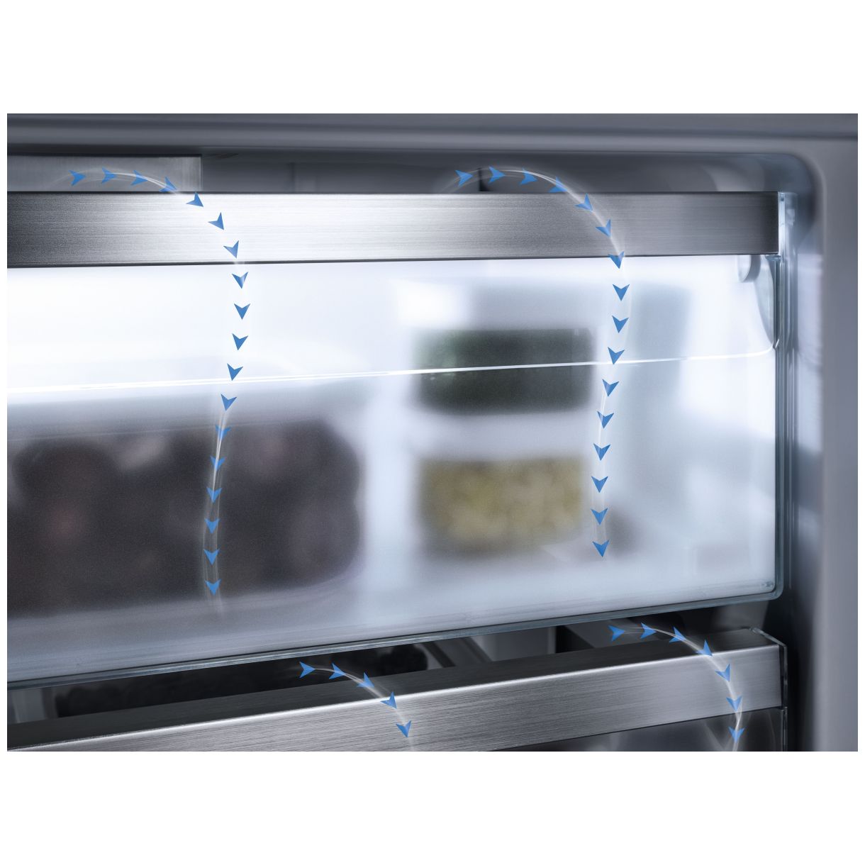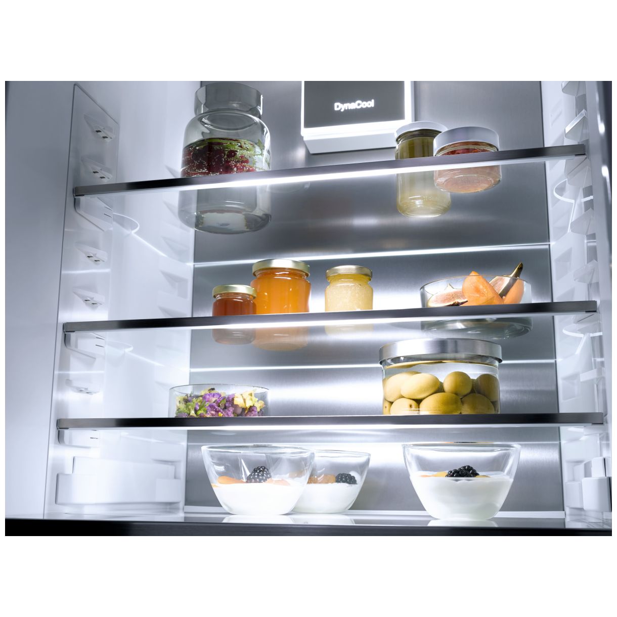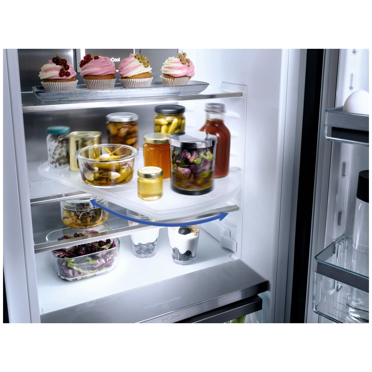 Szuflada Freeze&Cool działa jako komora chłodząca lub zamrażająca zwiększając przestrzeń. FlexiLight 2.0 podświetla i umożliwia indywidualne przestawianie półek. FlexiTray to obrotowa szklana podstawa ułatwiająca wyjmowanie produktów. Precyzyjna regulacja drzwi wewnętrznych dopasowuje wysokość półek. Ścianka tylna CleanSteel zapewnia równomierny rozkład zimna. NoFrost zapobiega oszranianiu komory mrożenia. DuplexCool oddziela obiegi chłodnicze zapobiegając mieszaniu zapachów. SoftClose delikatnie domyka drzwi. Kostkarka do lodu ze zbiornikiem wody (MyIce) produkuje lód.
