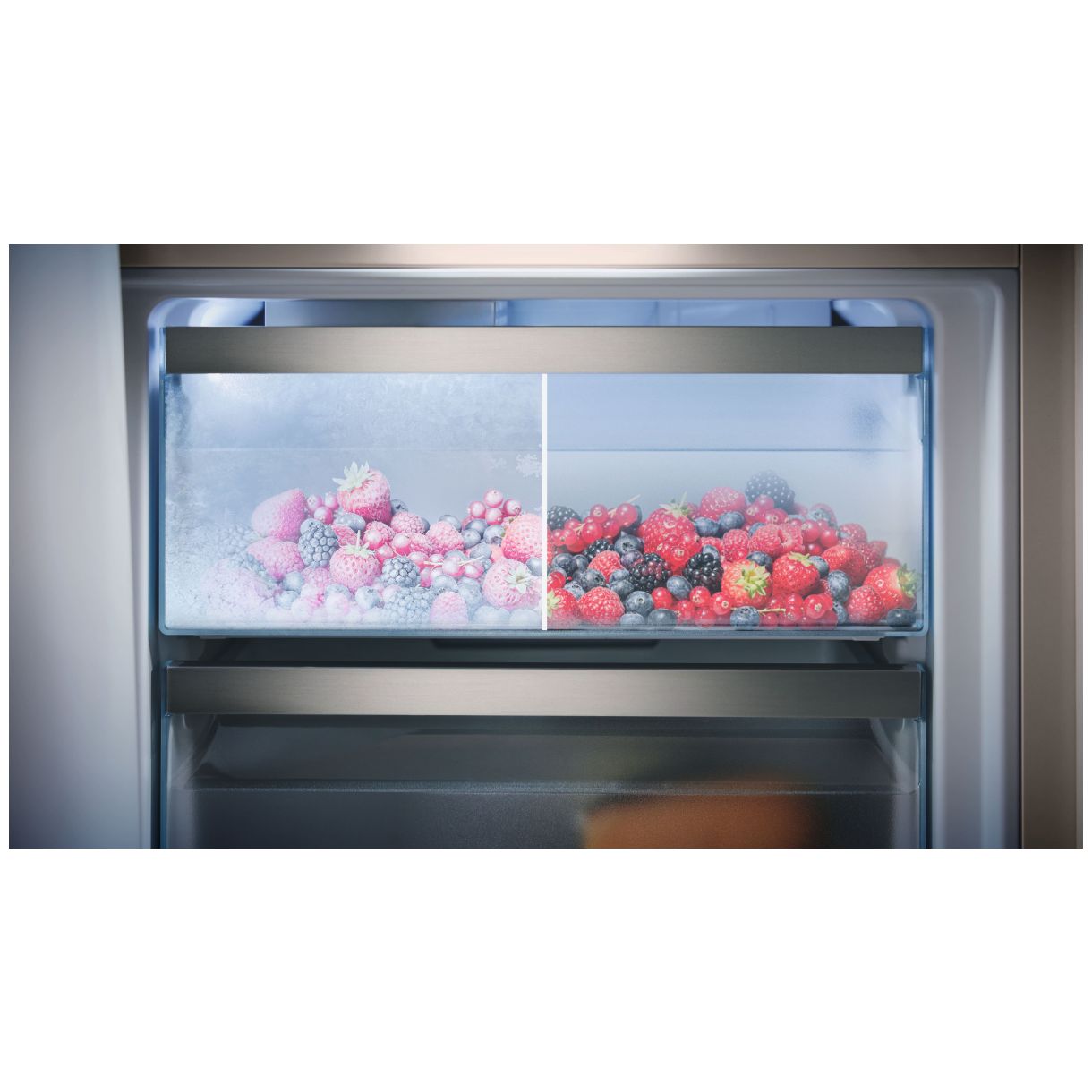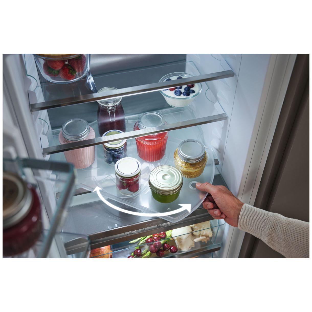 Szuflada Freeze&Cool elastycznie zmienia się w chłodziarkę lub zamrażarkę. PerfectFresh Active utrzymuje świeżość żywności do pięciu razy dłużej dzięki aktywnemu nawilżaniu i optymalnej temperaturze. Podświetlane półki FlexiLight 2.0 można indywidualnie przestawiać a obrotowa podstawa FlexiTray ułatwia dostęp. Precyzyjna regulacja drzwi wewnętrznych dopasowuje wysokość półek. Ścianka tylna CleanSteel równomiernie rozprowadza zimno. Technologia NoFrost eliminuje lód. DynaCool i DuplexCool zapewniają równy rozkład temperatury i brak mieszania zapachów. SoftClose i SelfClose domykają drzwi. Kostkarka do lodu z przyłączem świeżej wody automatycznie produkuje lód.