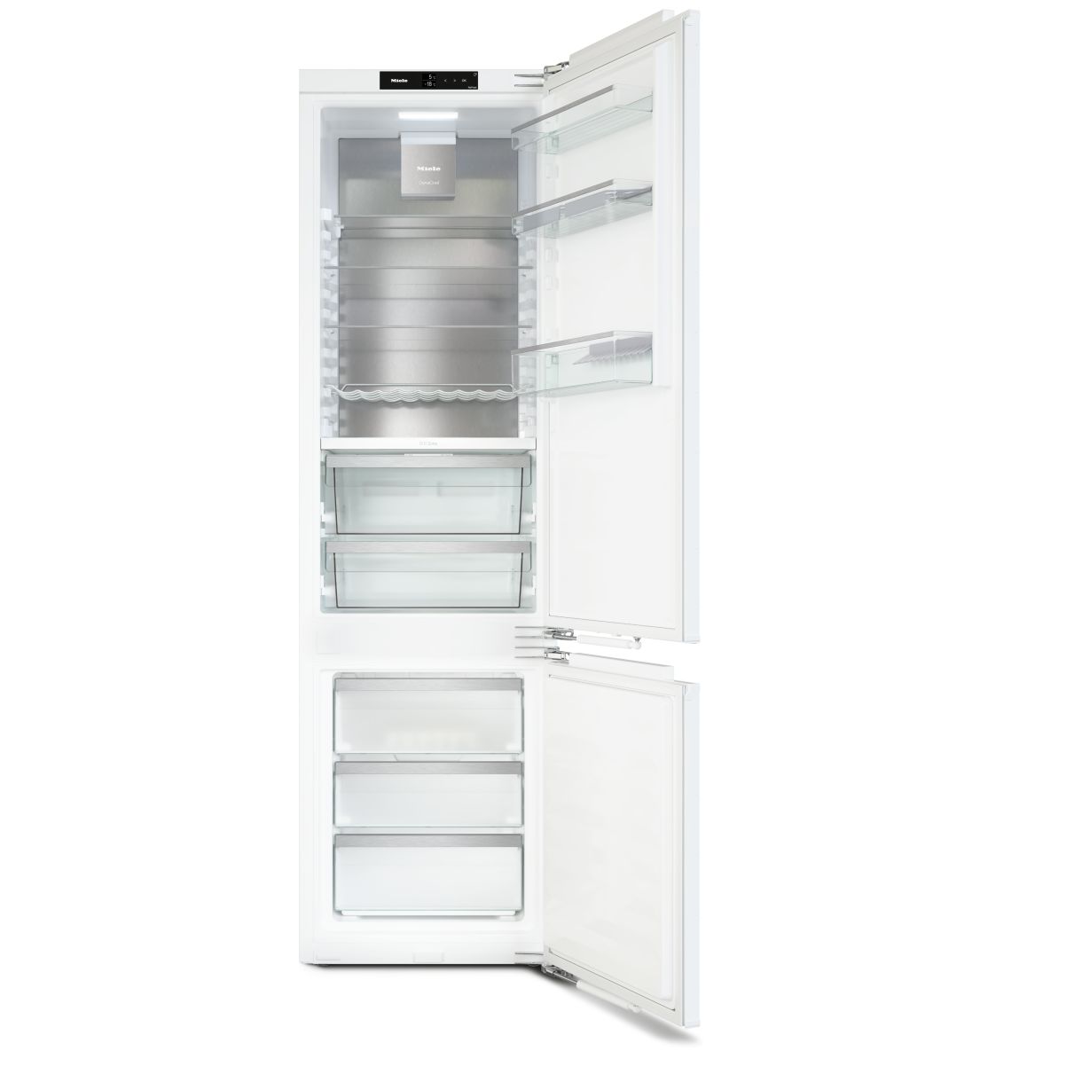 W zakresie mechaniki oświetlenie komory chłodzenia LED efektywnie rozjaśnia wnętrze. SoftClose łagodnie domyka drzwi. DynaCool równomiernie rozprowadza chłodne powietrze. NoFrost eliminuje rozmrażanie zamrażarki a DuplexCool zapobiega przenoszeniu zapachów między komorami. Elastyczność przestrzeni zapewniają ComfortSize VarioRoom oraz dzielona półka FlexiBoard. Sucha ścianka tylna CleanSteel ułatwia czyszczenie.