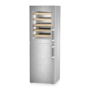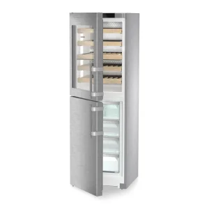 Model cechuje klasa efektywności energetycznej D, co przy rocznym zużycie energii 190 kWh/a przekłada się na zrównoważoną eksploatację i wysoką wydajność chłodzenia w szerokim zakresie temperatur (klasa klimatyczna SN-T). Wnętrze oferuje pojemność całkowita 303 l, z czego pojemność komory zamrażarki wynosi 133 l, a dedykowana pojemność komory do przechowywania wina to 171 l. System zarządzania przestrzenią obejmuje 4 schowki w komorze zamrażania (w tym 3 na płynnie działających szynach teleskopowych) oraz sekcję winiarską mieszczącą maksymalnie 44 butelki 0,75 l, spoczywające na drewnianych półkach o regulowanej wysokości. Utrzymanie urządzenia w czystości ułatwia wyposażenie przystosowane do mycia w zmywarce do naczyń oraz wymienna uszczelka drzwi, co znacząco upraszcza bieżącą konserwację.