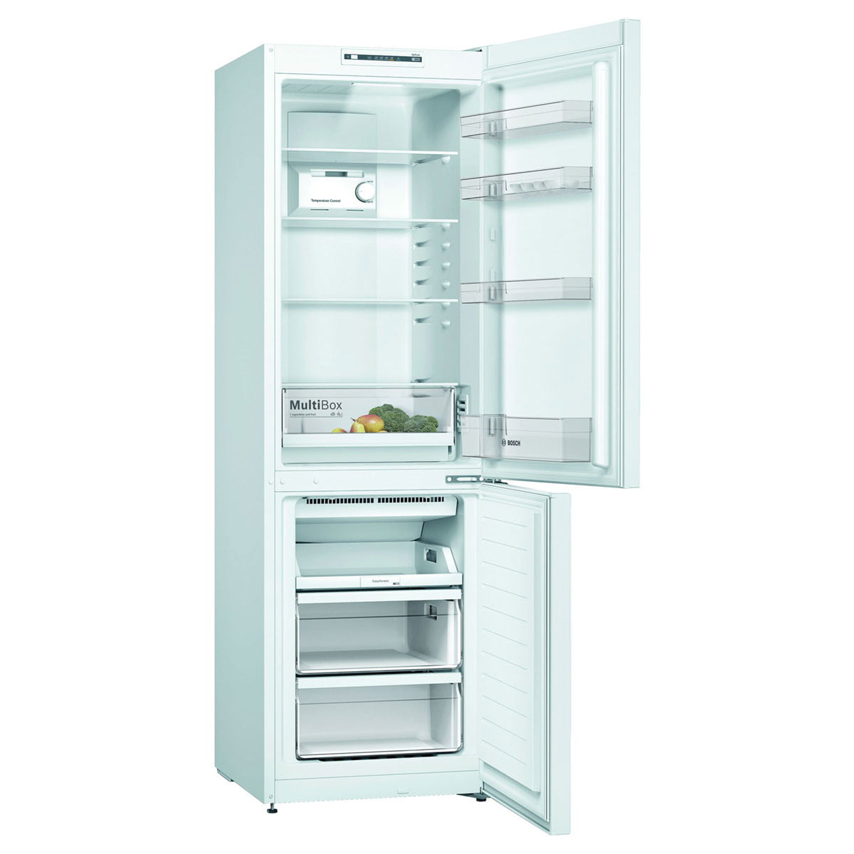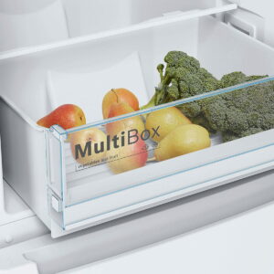 Chłodziarko-zamrażarka wolnostojąca Serie|2 z dolną zamrażarką idealnie wpasuje się w każdą przestrzeń. System MultiAirflow, wspomagany wentylatorem, zapewnia delikatne, równomierne rozprowadzenie zimnego powietrza na wszystkich poziomach. Urządzenie czuwa  nad bezpieczeństwem żywności, powiadamiając o niedomkniętych drzwiach czy wzroście temperatury głośnym sygnałem alarmowym lub sygnalizacją świetlną. Funkcja Supermrożenie zapewnia szybkie zamrożenie dokładanych produktów i zapobiega rozmrażaniu pozostałej zawartości zamrażarki. MultiBox XXL oferuje mnóstwo miejsca na świeżą żywność.