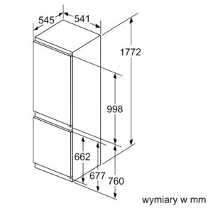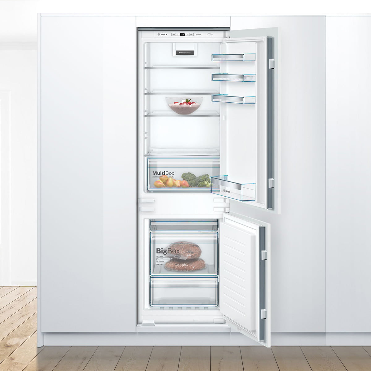 Zamrażarka: technologia NoFrost, 3 szuflady w zamrażarce w tym 1 duża typu BigBox, VarioZone, supermrożenie, zdolność zamrażania 8kg/24h, poziom hałasu: 39 dB(A) re1pW, zawiasy ślizgowe.