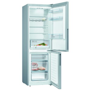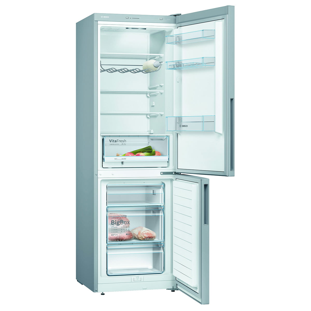 Chłodziarko-zamrażarka wolnostojąca Serie|4 zadba o Twoją żywność. System Low Frost zmniejsza ilość lodu w zamrażarce, eliminując potrzebę częstego rozmrażania. Oświetlenie LED pomaga mieć oko na wszystko w lodówce. Przechowywane owoce i warzywa zachowują cenne witaminy i pozostaną świeże przez dłuższy czas dzięki VitaFresh. Wyjątkowo głęboka szuflada na produkty mrożone BigBox umożliwia wygodne układanie pojemników lub dużych porcji mrożonej żywności. Funkcja Supermrożenie to zabezpieczenie zamrożonych produktów przed ich rozmrożeniem.