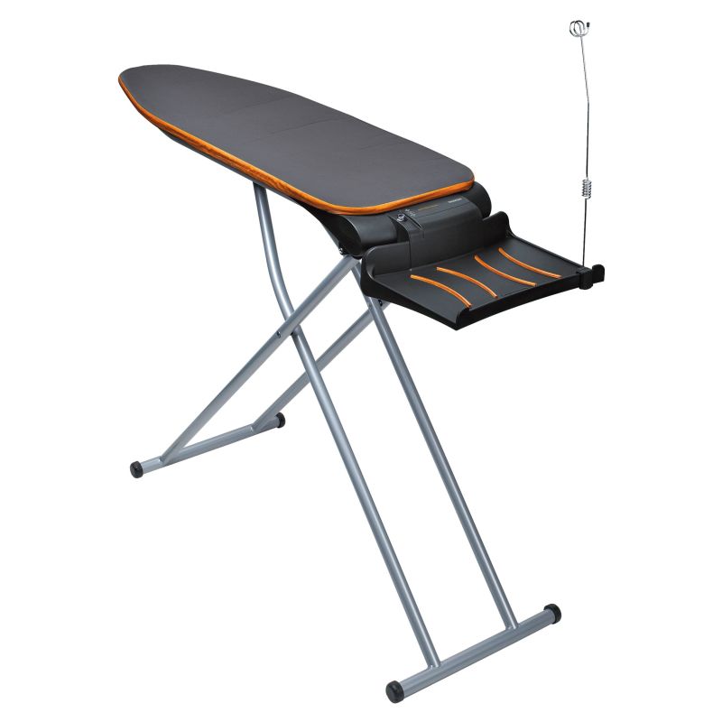 materiały i umożliwia prasowanie bez potrzeby przyciskania ich do powierzchni deski, podstawka pod żelazko, antenka podtrzymująca przewód, wbudowane gniazdo sieciowe, przewód zasilający o długości 1,7 m, 6 pozycji regulacji wysokości od 75 do 100 cm, wymiary powierzchni do prasowania (SxG): 120×38 cm , kolor: szary/pomarańczowy
