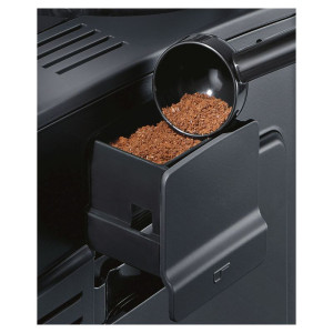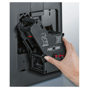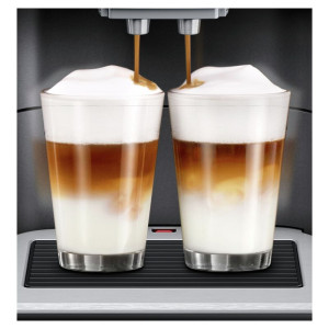 Funkcje: wyjmowany pojemnik na wodę (2,3 l), pojemnik na kawę ziarnistą: 235 g, technologia sensoFlow System, aromaPressure System, wyświetlacz wyboru kawy coffeeSelect Display, funkcja oneTouch dla: espresso, espresso macchiato, kawy, cappuccino, kawy z mlekiem, latte macchiato, americano, flat white, cafe cortado, aromaDouble Shot, młynek ceramiczny ceramDrive z wielostopniową regulacją zmielenia kawy, dystrybutor kawy i dysza spieniająca mleko z regulacją wysokości, autoMilk Clean, system odkamieniania calc’nClean, możliwość używania kawy mielonej, funkcje przygotowania gorącej wody, gorącego mleka, mlecznej pianki, 3-stopniowa regulacja temperatury kawy, możliwość zapamiętania indywidualnych ustawień dla 2 napojów, oneTouch DoubleCup, regulacja proporcji kawa-mleko. W zestawie 1 x filtr wody Brita INTENZA, który poprawia smak kawy i wydłuża żywotność urządzenia. Kolor: czarny metalik (front)