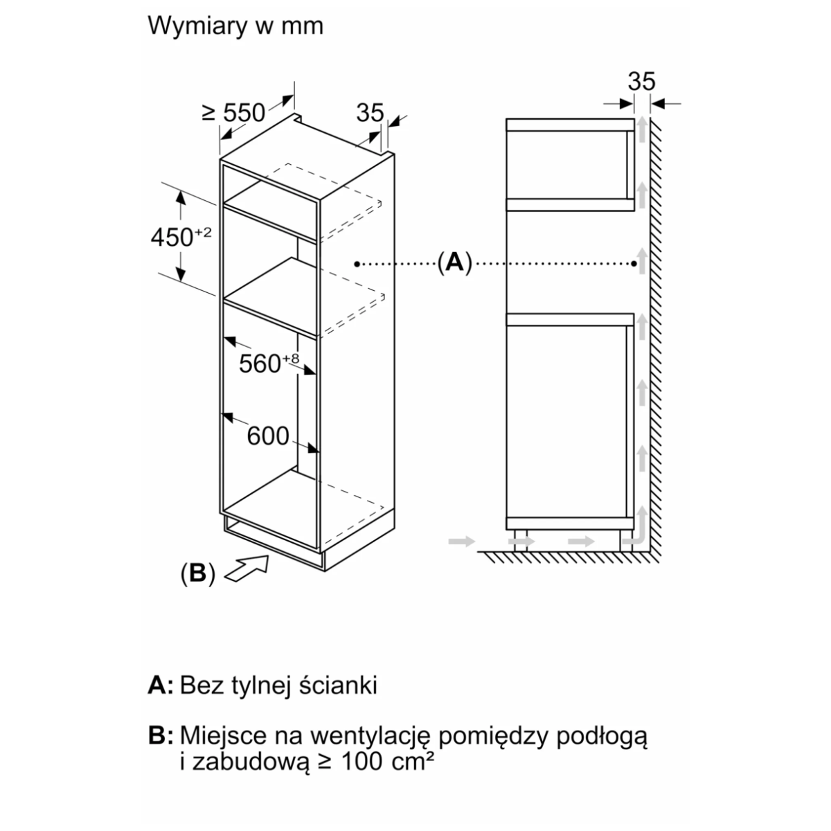 | Wymiary niszy montażowej (WxSxG) | 450–458 × 560–568 × 550 mm |