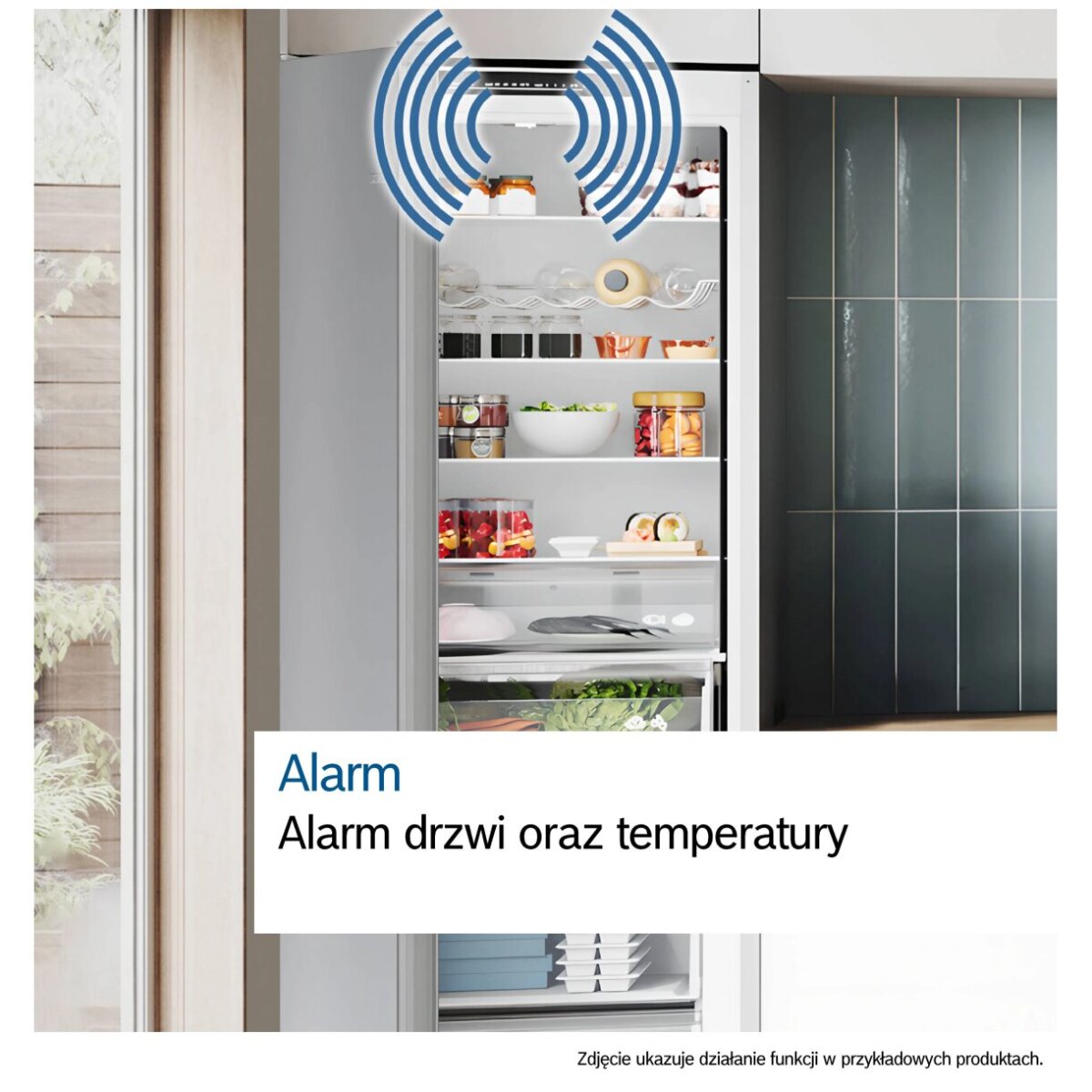 Przestronna chłodziarko-zamrażarka do pełnej zabudowy z VitaFresh XXL <0°C> dla dłuższej świeżości owoców i warzyw, bezszronowym NoFrost (zamrażarka) oraz cichą technologią inwerterową. Wygodę zapewniają elektroniczna regulacja z wyświetlaczem LED, Superchłodzenie (auto-dezaktywacja), Supermrożenie, alarm otwartych drzwi oraz dodatkowe oświetlenie zamrażarki Freezer Light.