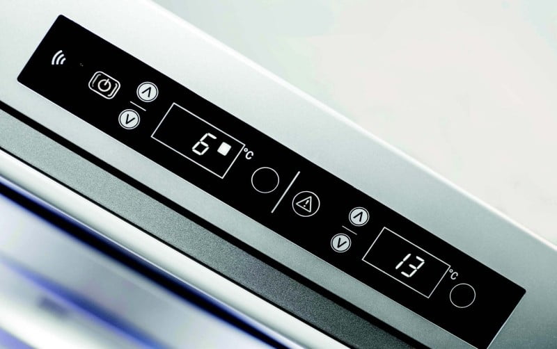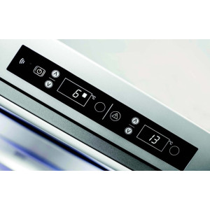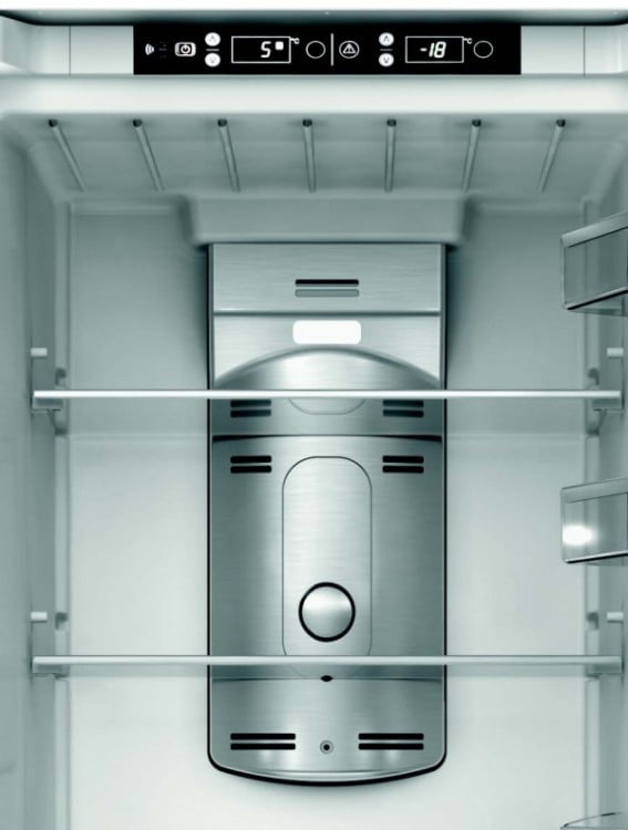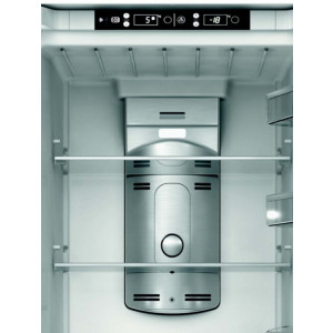 Wentylator chłodzenia ARIA+ (dzięki zastosowaniu wentylatora w komorze chłodziarki zapewniony jest stały obieg powietrza, dzięki czemu temperatura rozprowadzana jest równomiernie, a żywność zachowuje świeżość. Wymuszony obieg powietrza zapobiega również skraplaniu się wody na tylnej ściance komory chłodziarki i pod szklanymi półkami)