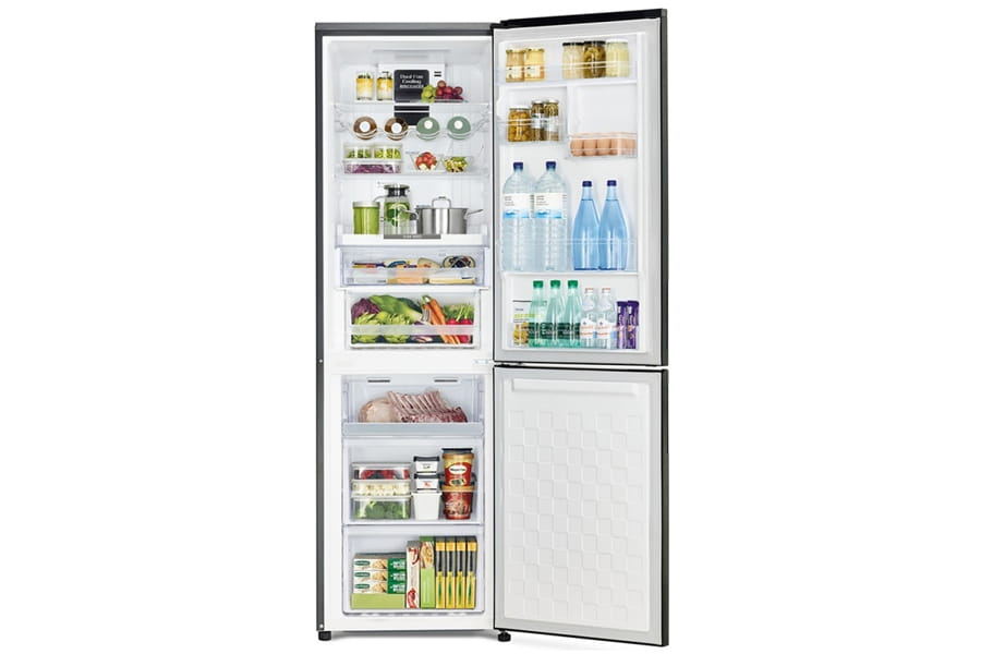 Full No Frost (bezszronowa w obydwu komorach), 2 drzwi (komora zamrażarki – na dole), front z bezpiecznego szkła w kolorze czarnym z delikatnym, brokatowym połyskiem, panel sterowania w drzwiach.