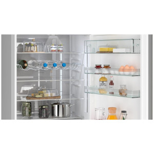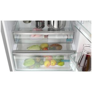 Extra pojemna chłodziarko-zamrażarka o szerokości 70 cm z technologią Total noFrost (koniec z rozmrażaniem), tylną ścianką metal backwall i systemem multiAirflow dla równomiernego chłodzenia. hyperFresh 0°C zapewnia idealne warunki dla mięsa i ryb, a szuflada z regulacją wilgotności dba o świeżość warzyw i owoców. Kompresor inwerterowy pracuje cicho i energooszczędnie, a rozwiązanie No distance pozwala dosunąć urządzenie bezpośrednio do ściany (pełny dostęp przy 90° otwarcia drzwi).