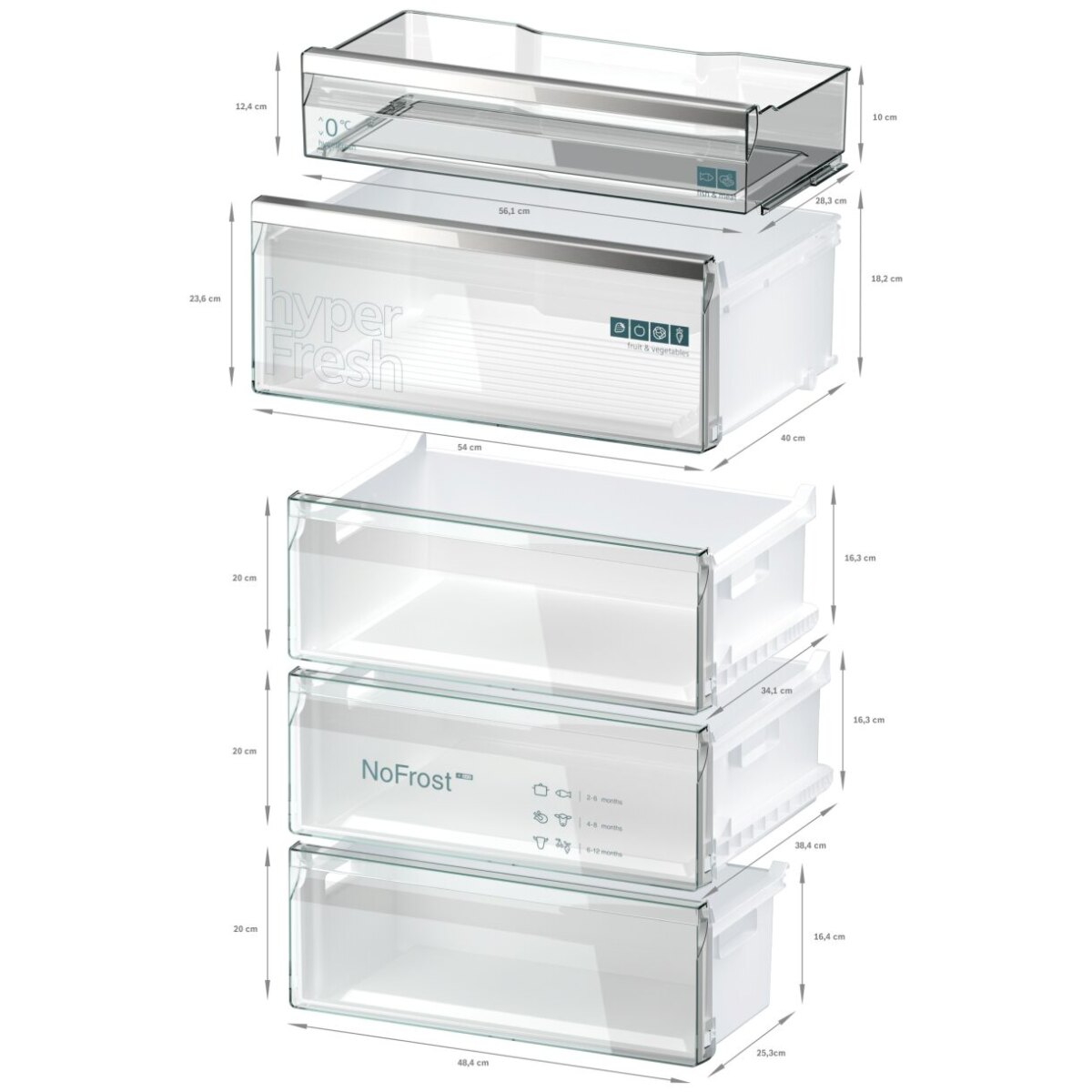 | Technologie | Total noFrost (chłodziarka i zamrażarka), kompresor inwerterowy, metal backwall + multiAirflow, hyperFresh 0°C, superchłodzenie (auto wyłączenie), supermrożenie, No distance (pełny dostęp przy 90°) |