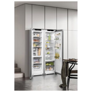 Chłodziarko-zamrażarka typu side-by-side wyróżnia się bardzo dużą objętością i doskonałą jakością wykonania. Komory BioFresh-Safe pozwalają zachować świeżość przechowywanych produktów. Nigdy więcej lodu i szronu dzięki technologii NoFrost chroniącej zamrażalnik. Wyświetlacz dotykowy umożliwia wybieranie funkcji lub sprawdzenie aktualnej temperatury w lodówce. Łatwe czyszczenie zapewnia CleaningMode, a funkcja SuperFrost zwiększa wydajność chłodzenia. Tryb NightMode wyłącza wszystkie dźwięki i odgłosy oraz przyciemnia oświetlenie wewnętrzne.