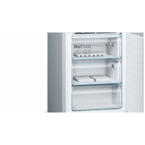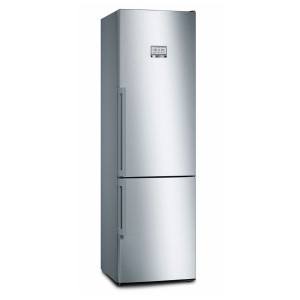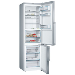 Home Connect ready – adapter do nabycia w sklepie serwisowym Pojemność 343l (256+87), W203xS60xG66cm, klasa efektywności energ. A+++, 180 kWh/rok, NoFrost, automatyczne odszranianie w chłodziarce i zamrażarce, elektroniczna regulacja temperatury, wyświetlacz cyfrowy LCD Touch Control zintegrowany w drzwiach. Chłodziarka: Multi Airflow, AirFreshFilter – aktywny filtr węglowy, oświetlenie LED typu spotlight i boczne, superchłodzenie, 4 szklane półki w tym 3 o regulowanej wysokości, stelaż na butelki, zamykana górna półka na drzwiach, strefa świeżości VitaFresh pro <> 0 °C: szuflada na warzywa i owoce z regulacją wilgotności oraz szuflada na mięso i ryby, oddzielne sterowanie temperaturą w strefie VitaFresh na zewnętrznym wyświetlaczu, alarm otwartych drzwi. Zamrażarka ****: 3 szuflady, supermrożenie, alarm wzrostu temperatury, zdolność zamrażania 14kg/24h, kolor drzwi: stal szlachetna, powłoka Antifingerprint na drzwiach.