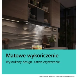 Wysoką kulturę pracy gwarantuje cichy napęd, generujący moc akustyczną przy prędkości maks. 57 dB, co pozwala na swobodną komunikację w kuchni podczas gotowania. W trybie intensywnym urządzenie osiąga moc akustyczną w trybie turbo 68 dB, skutecznie eliminując intensywne opary. Wysoka sprawność mechaniczna idzie w parze z oszczędnością eksploatacyjną, co potwierdza klasa efektywności energetycznej A+ oraz niskie roczne zużycie energii 27.2 kWh/rok.