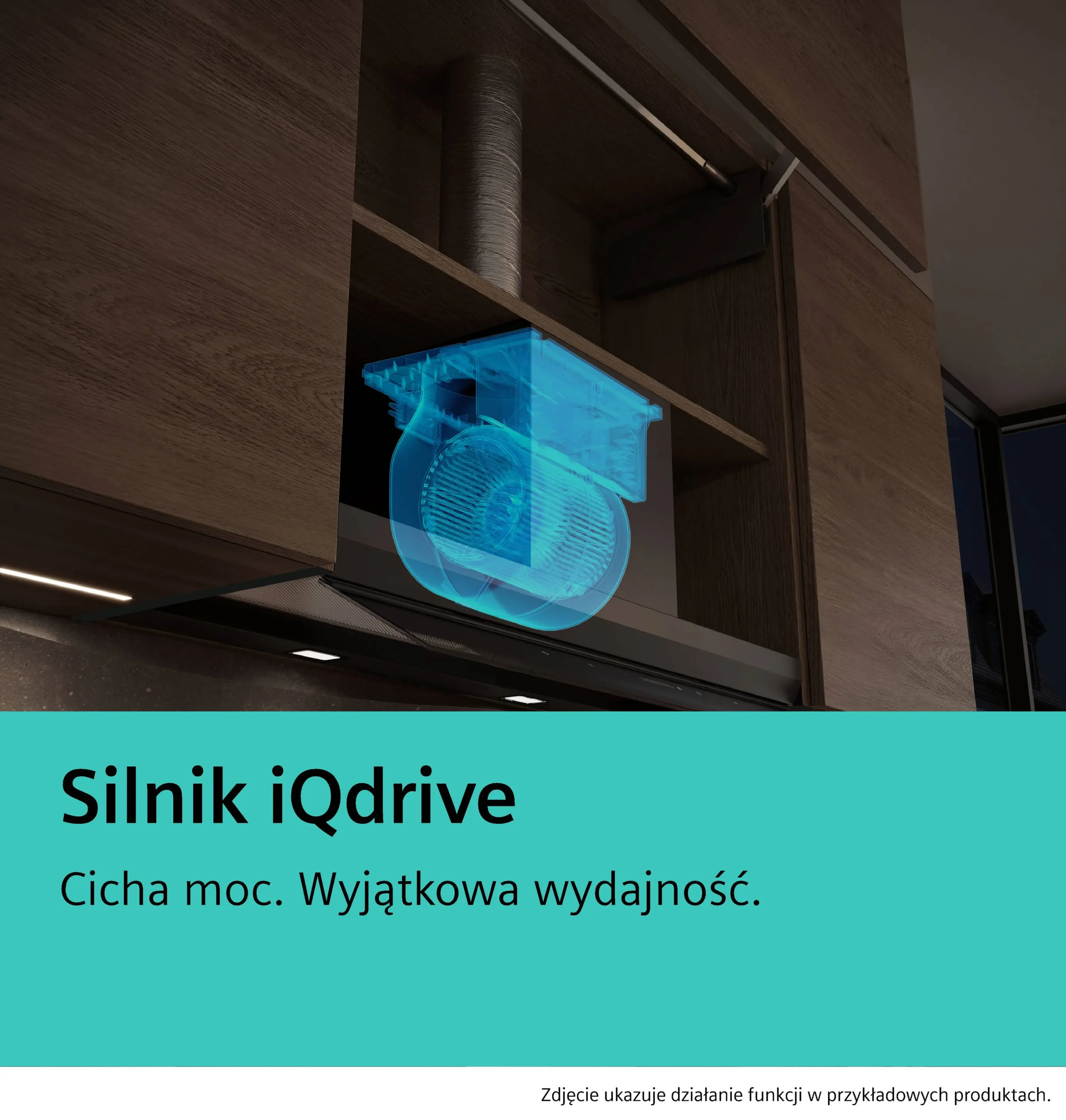 Konstrukcja opiera się na technologii cichy i energooszczędny silnik typu BLDC - iQdrive, który dzięki wyeliminowaniu tarcia mechanicznego pracuje przy zachowaniu wysokiej wydajności, co potwierdza klasa efektywności energetycznej A+. Oświetlenie LED o natężeniu pełna jasność 437 lux i temperaturze neutralne (3.500 K) równomiernie doświetla płytę grzewczą, a funkcja oświetlenie typu softLight płynnie reguluje natężenie światła przy włączaniu i wyłączaniu.
