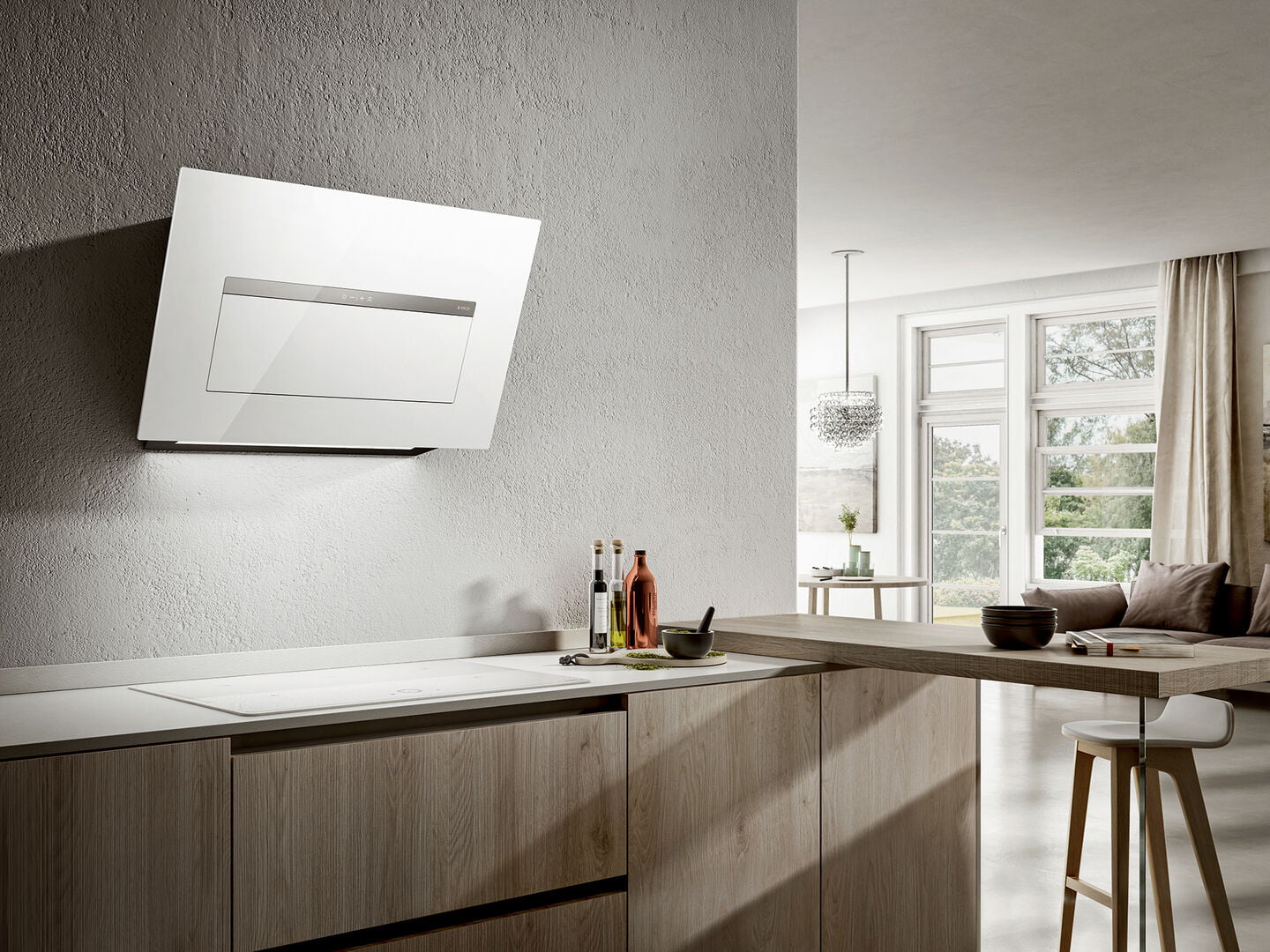 Poznaj Bloom-S, okap naścienny o wysokiej wydajności. Model przyciąga uwagę dzięki prostej, geometrycznej bryle, a elegancki design sprawia, że idealnie pasuje do nowoczesnych, przestronnych wnętrz.