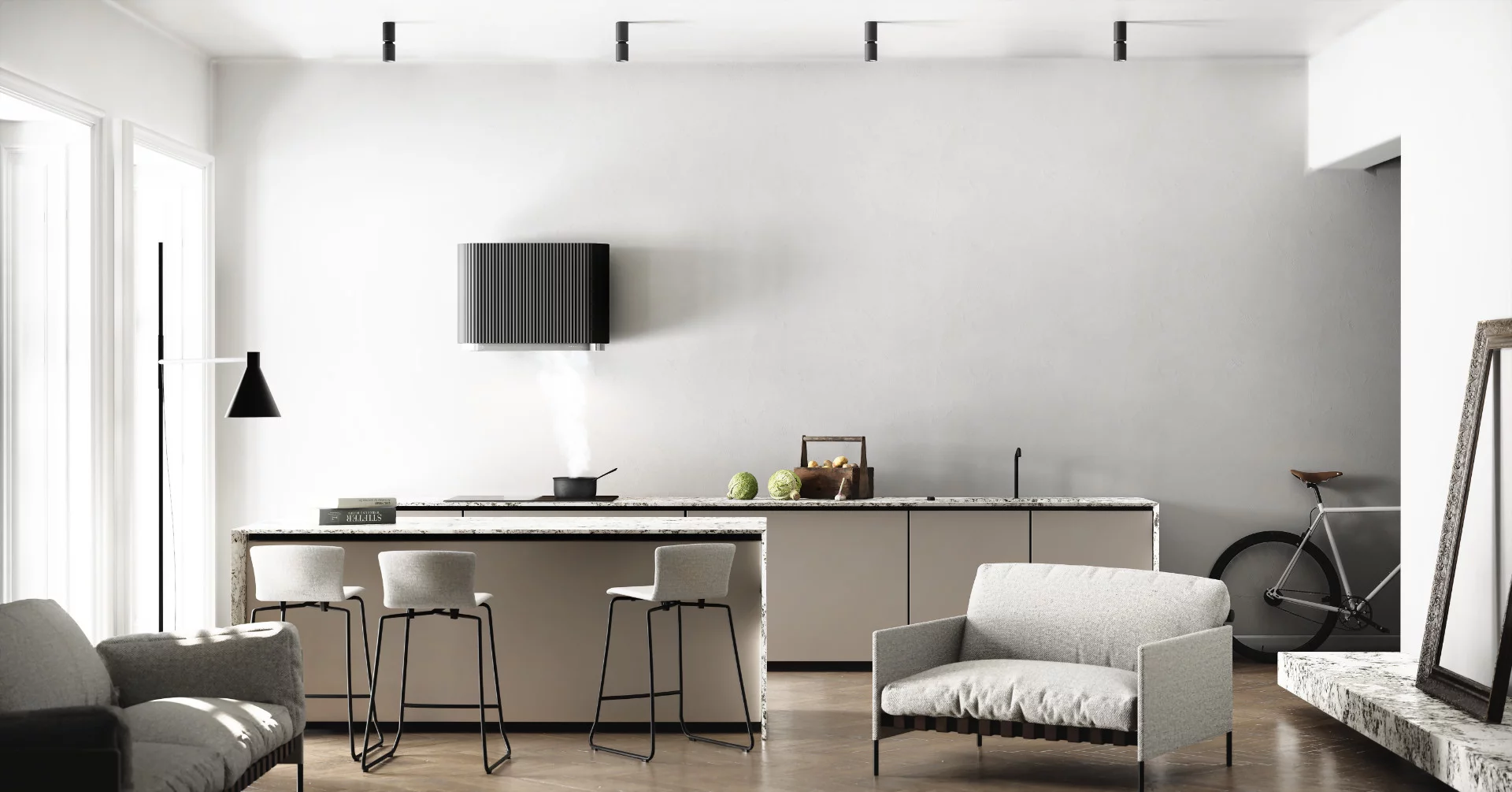 Okap Mono został również wyposażony w zaawansowany system filtracji, który skutecznie usuwa tłuszcz, zanieczyszczenia i pyły z powietrza, gwarantując czyste i zdrowe środowisko w kuchni.