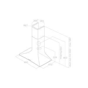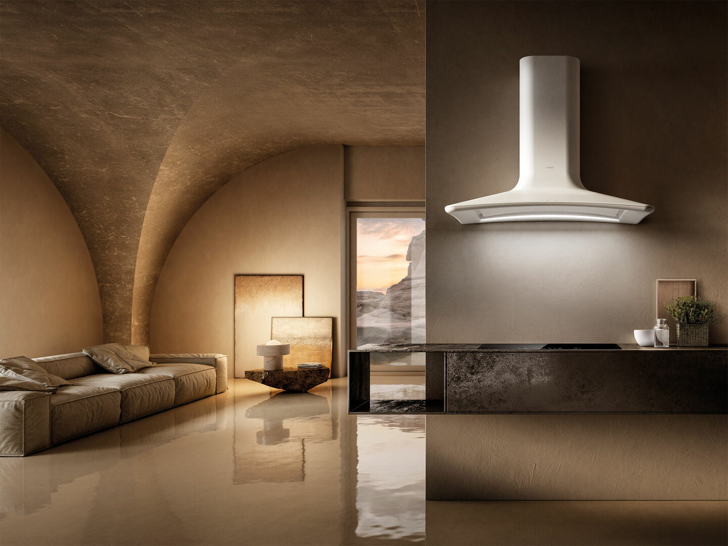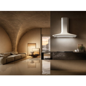 Sweet schodzi, rozszerza się i łagodnie wygina, obrysowując ścianę jak rzeźba, jego szczególny projekt przywołuje postindustrialny styl.Dostępny zarówno w wersji filtrującej jak i wyciągowej z przedłużeniem komina.