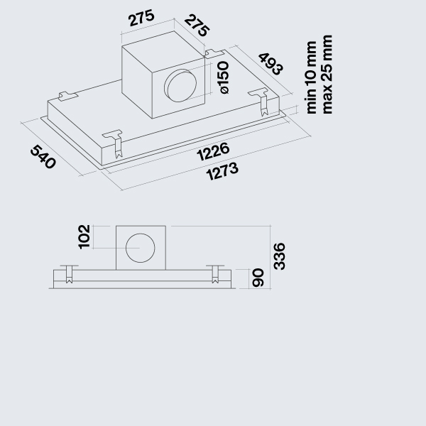 Dane ogólne: Wyciąg szczelinowy, Sterowanie elektroniczne, Filtr przeciwtłuszczowy metalowy, wymienny z możliwością mycia, Pilot w zestawie, Dynamic LED Light (2700K – 5600K), Silnik sprzedawany oddzielnie