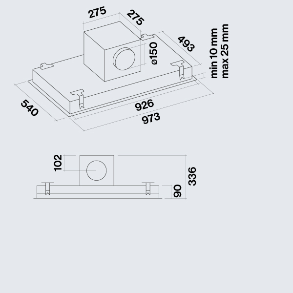 Dane ogólne: Wyciąg szczelinowy, Sterowanie elektroniczne, Filtr przeciwtłuszczowy metalowy, wymienny z możliwością mycia, Pilot w zestawie, Dynamic LED Light (2700K – 5600K), Silnik sprzedawany oddzielnie