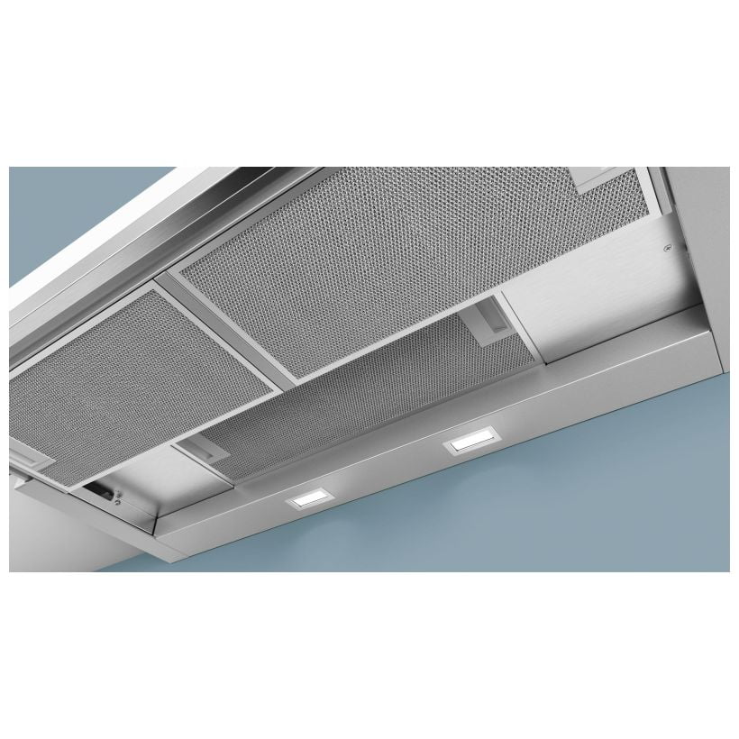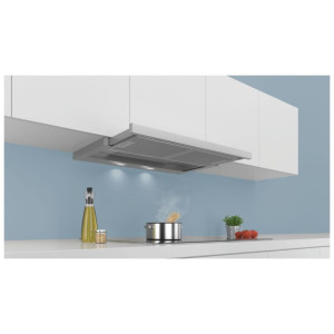 Okap teleskopowy do zabudowy w szafce nad płytą do gotowania.
