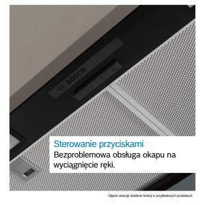 Okap Bosch Serie 4 DBB85CC60 wykorzystuje mechaniczne sterowanie za pomocą przycisków, co pozwala na bezpośredni wybór jednego z 3 poziomów prędkości pracy wentylatora. Urządzenie osiąga maksymalną wydajność w trybie otwartym 582 m³/h, co umożliwia szybką wymianę powietrza w pomieszczeniu podczas intensywnego smażenia. W przypadku konfiguracji jako pochłaniacz, maksymalna wydajność w trybie zamkniętym wynosi 521 m³/h. Silnik o łącznej mocy 185 W generuje poziom hałasu 65 dB przy najwyższym stopniu biegu otwartego, co pozwala na zachowanie swobody komunikacji w kuchni.