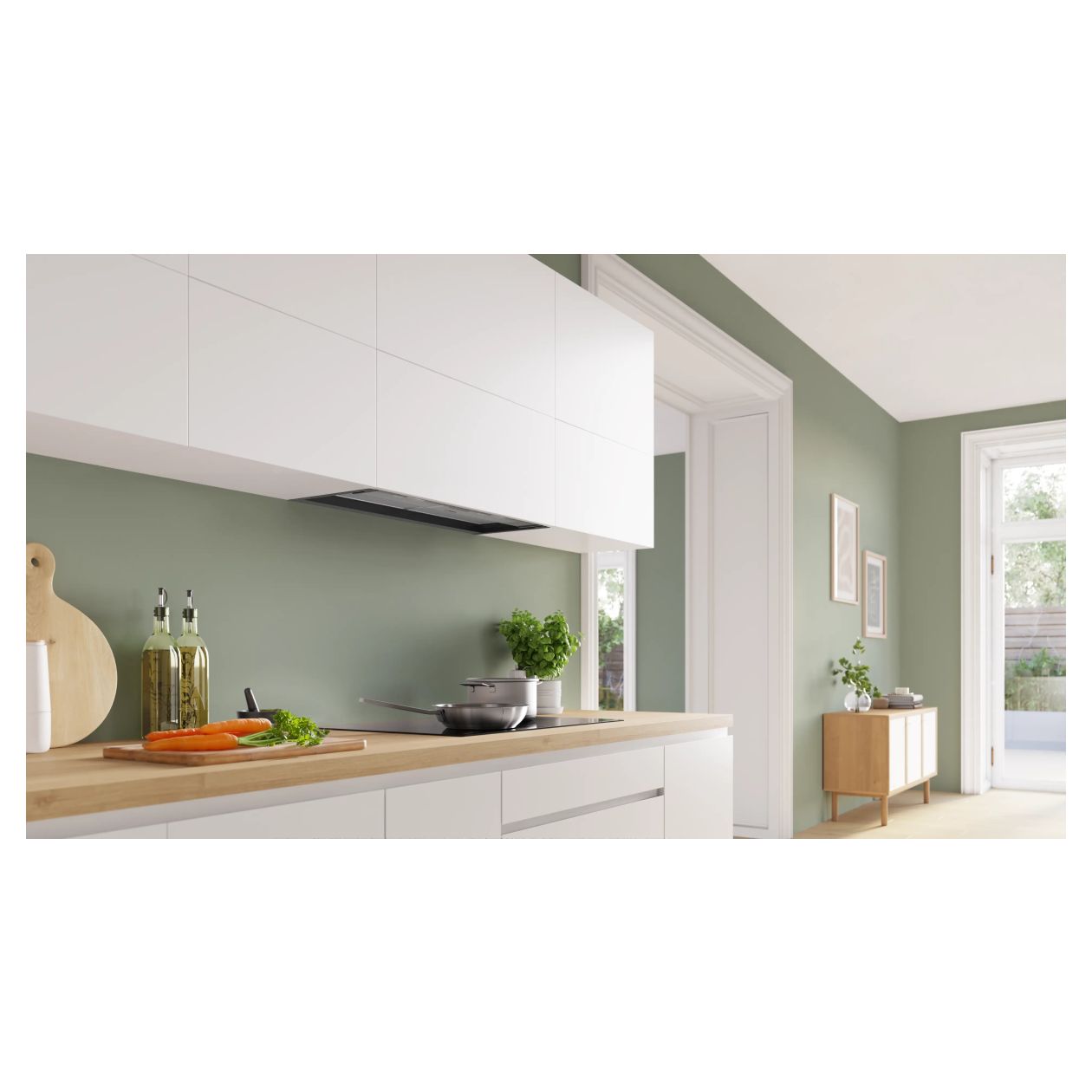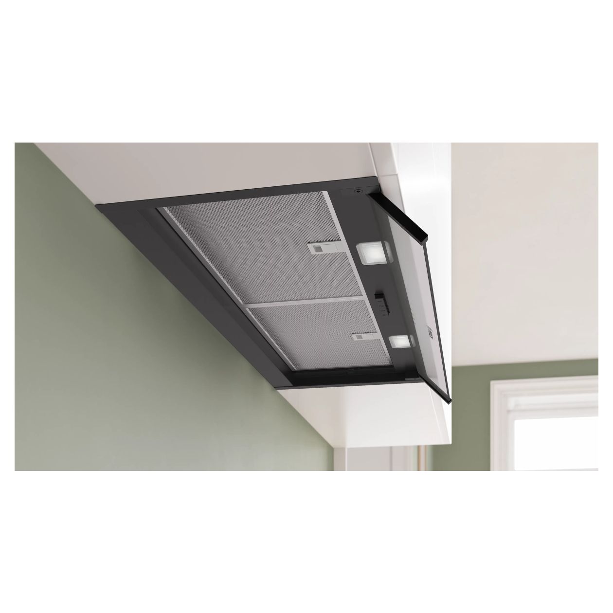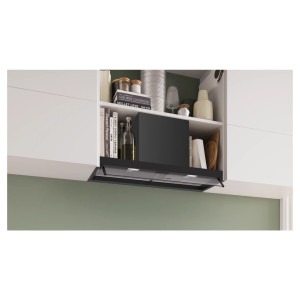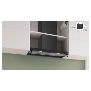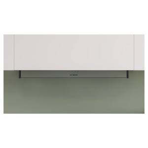 Zintegrowany Okap Bosch Serie 4 DBB85CC60 to rozwiązanie zaprojektowane z myślą o pełnej dyskrecji i efektywnym zagospodarowaniu przestrzeni kuchennej. Dzięki konstrukcji przeznaczonej do zabudowy o szerokości 798 mm oraz głębokości 298 mm, urządzenie idealnie komponuje się z linią szafek górnych, pozostając niemal niewidoczne dla oka. Elegancki, czarny kolor obudowy oraz front wykonany z czystego szkła podkreślają minimalistyczny charakter wnętrza, jednocześnie zapewniając trwałość i odporność na warunki panujące podczas gotowania.