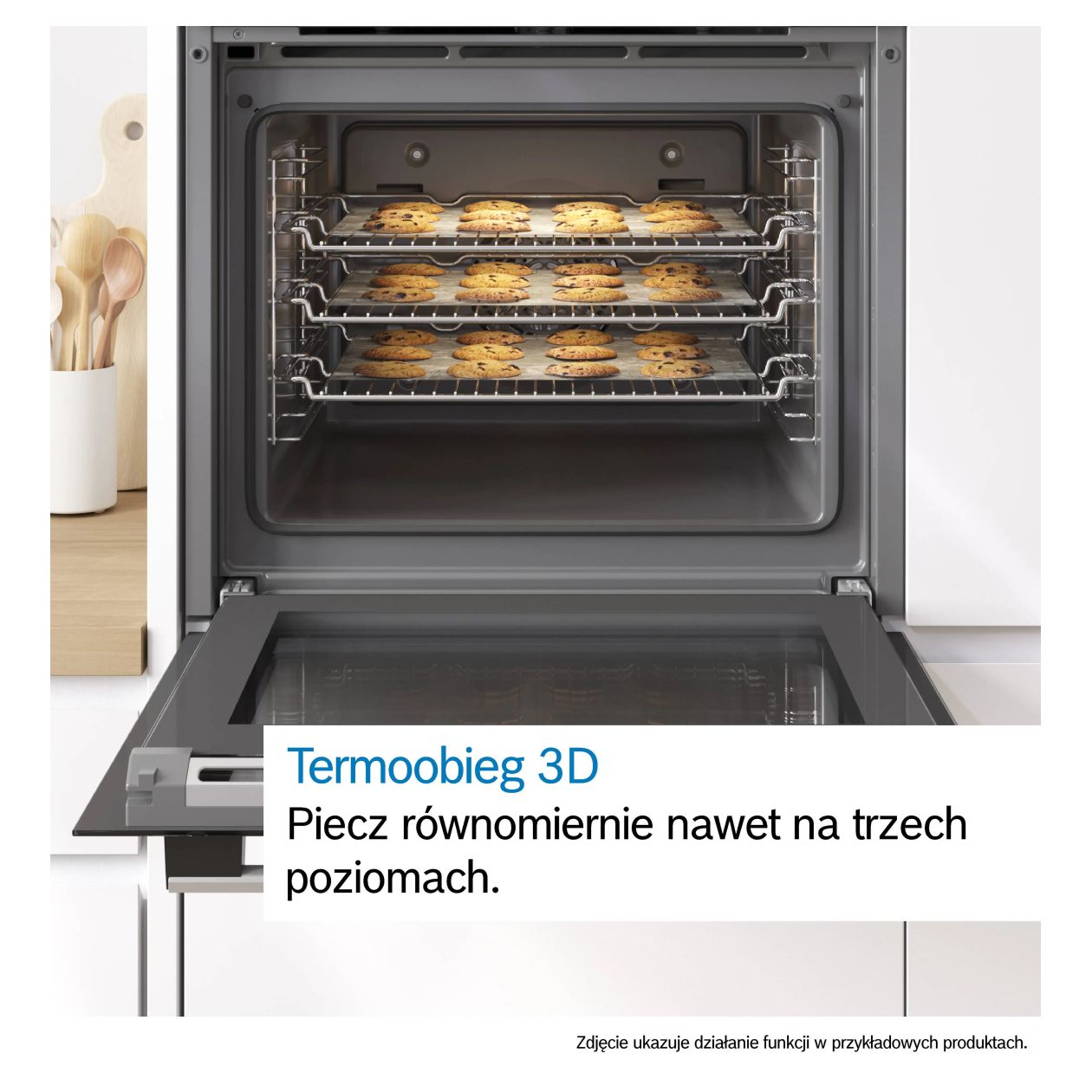 Termoobieg 3D wykorzystuje wentylator do wymuszania ruchu powietrza, co pozwala na równomierną dystrybucję ciepła na trzech poziomach jednocześnie, zapobiegając przenikaniu się zapachów dań. Prowadnice na 1 poziomie stabilizują blachy podczas ich wysuwania, chroniąc przed przechyleniem i ułatwiając dostęp do potraw. Konstrukcja zawiera drzwi opuszczane z zawiasami wyciszającymi, które mechanicznie spowalniają ruch frontu, zapobiegając jego gwałtownemu uderzeniu o obudowę.