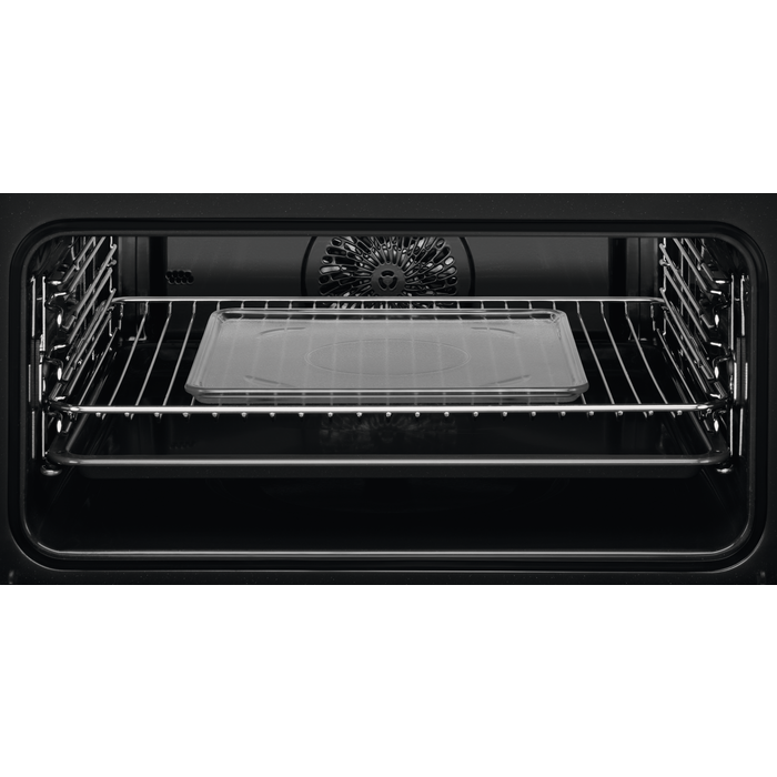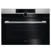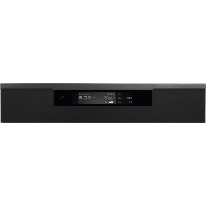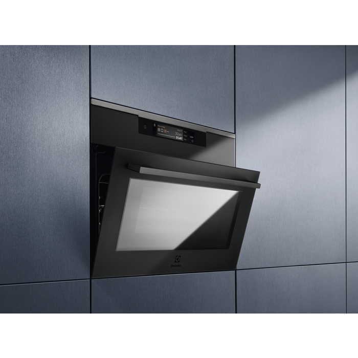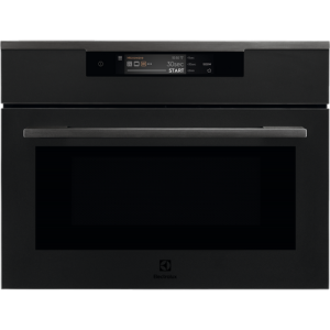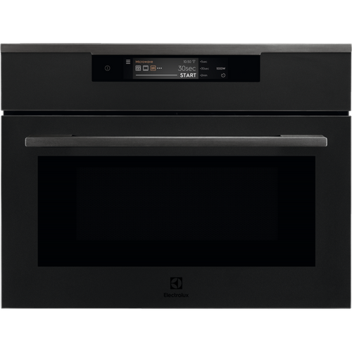 Kompaktowe urządzenie do zabudowy, produkt marki Electrolux, to piekarnik z funkcją mikrofali. Panel przedstawia się jako szklany panel osadzony w stalowej ramce. Urządzenie oferuje szereg funkcji, m.in. rozmrażanie i mikrofale, wyrastanie ciasta, suszenie, grill, utrzymywanie ciepła, mikrofale z płynami, pizza, ogrzewanie talerzy, podgrzewanie, powolne gotowanie, termoobieg, oraz różne kombinacje grillowania i mikrofal. Automatyczne programy wagowe ułatwiają obsługę, a funkcja pamięci pozwala zapisywać często używane ustawienia.