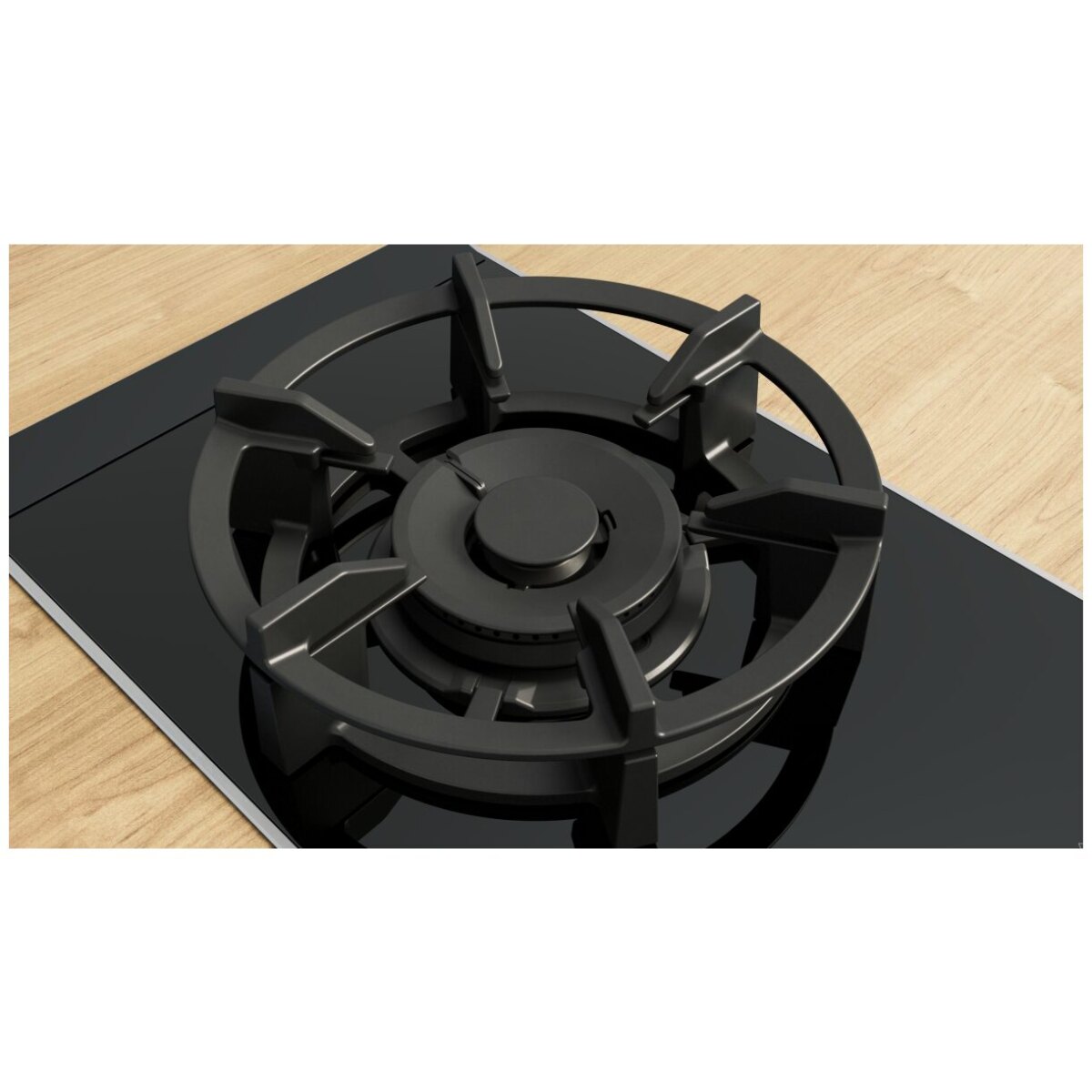 Kompaktowa płyta gazowa 30 cm z palnikiem Wok (do 6 kW) i precyzyjną regulacją płomienia FlameSelect (9 poziomów). Łatwa w czyszczeniu dzięki zdejmowanym metalowym pokrętłom i żeliwnemu rusztowi przystosowanemu do mycia w zmywarce. Wygodne sterowanie z przodu (pokrętła mieczykowe) z zapalarką w pokrętle (zapłon jedną ręką). Bezpieczeństwo zapewnia termoelektryczne zabezpieczenie przeciwwypływowe gazu; elegancji dodaje płaskie wzornictwo palnika.