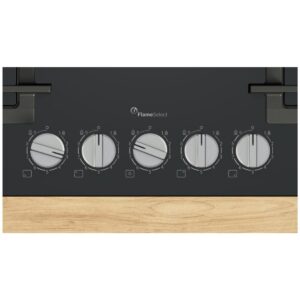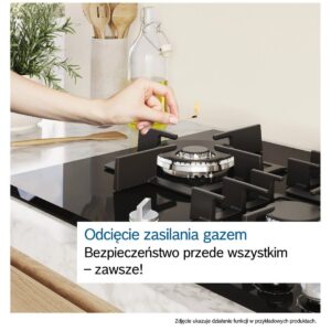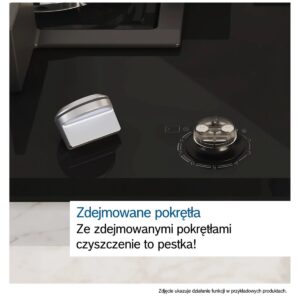 Szeroka płyta gazowa 75 cm z precyzyjną regulacją płomienia FlameSelect (9 poziomów). Zdejmowane metalowe pokrętła i dzielone ruszty żeliwne przystosowane do zmywarki ułatwiają czyszczenie. Wygodne pokrętła mieczykowe z przodu oraz zapalarka w pokrętle (zapłon jedną ręką) zapewniają komfort obsługi, a termoelektryczne zabezpieczenie przeciwwypływowe gazu dba o bezpieczeństwo. Możliwy montaż na równi z blatem lub tradycyjny.