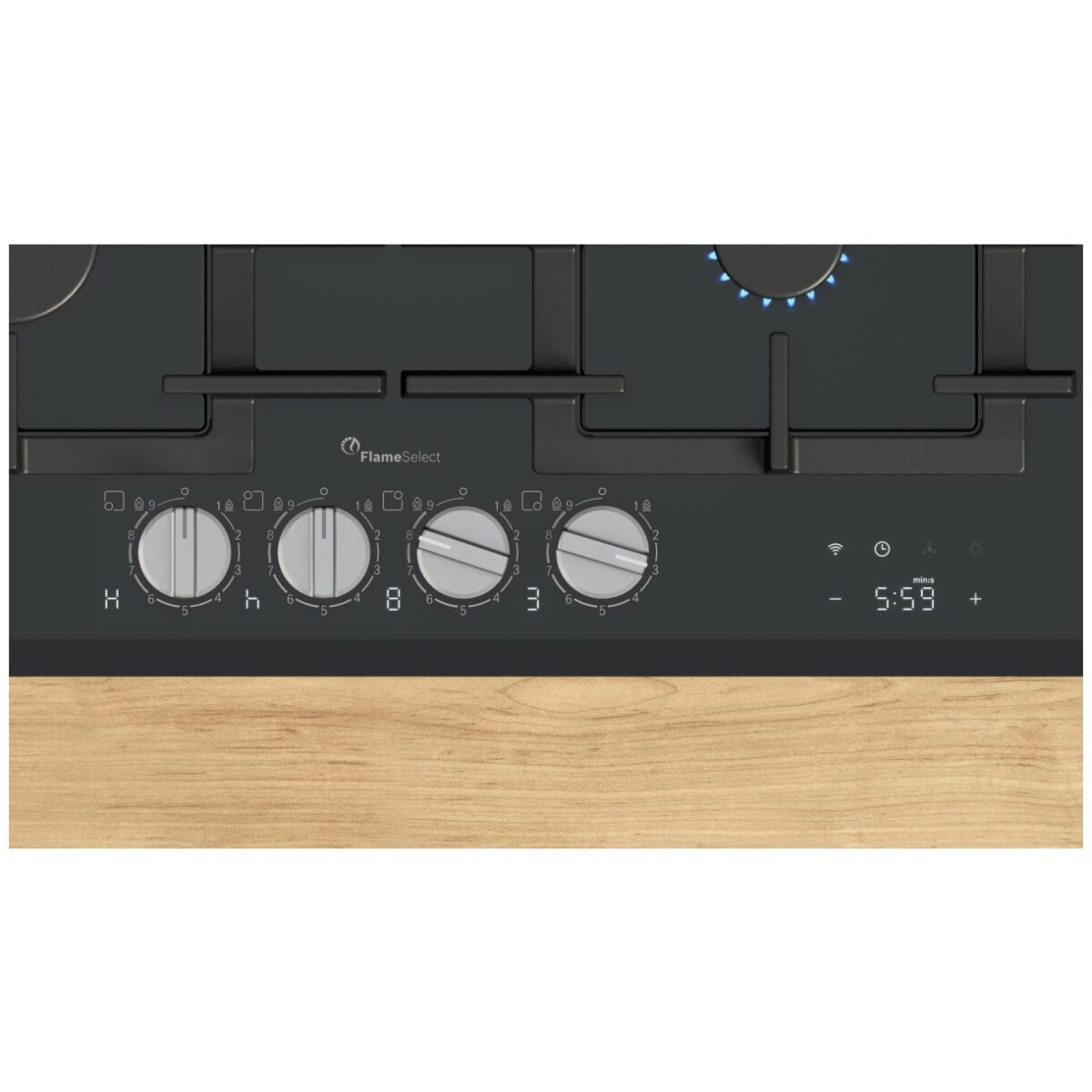 Płyta gazowa 60 cm z precyzyjną regulacją płomienia FlameSelect (9 poziomów), podświetlanymi metalowymi pokrętłami i wyświetlaczem cyfrowym pokazującym poziom mocy oraz ciepło resztkowe. Zdejmowane pokrętła i dzielony żeliwny ruszt przystosowany do zmywarki ułatwiają czyszczenie, a zapalarka w pokrętle pozwala na zapłon jedną ręką. Współpracuje z okapem przez Home Connect (Wi-Fi) – Smart Hood Automatic automatycznie dopasowuje pracę okapu, a TouchControl umożliwia wygodne zarządzanie czasem gotowania i funkcjami okapu.