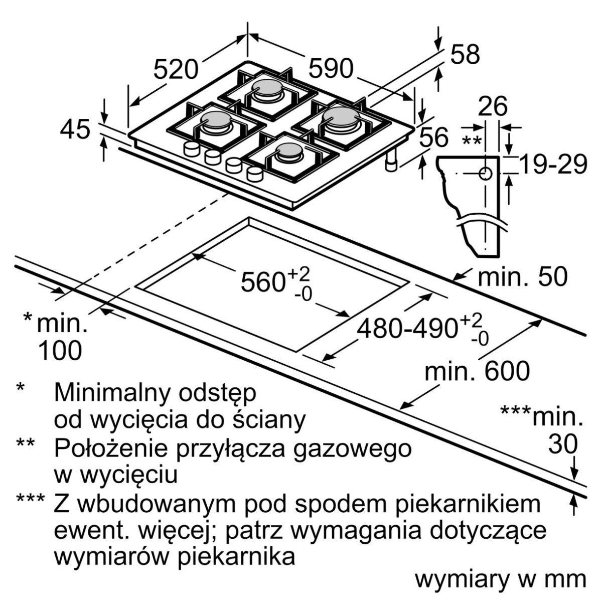 | Wymagane wymiary montażowe wnęki (WxSxG) | 45 × 560 × 480–490 mm |