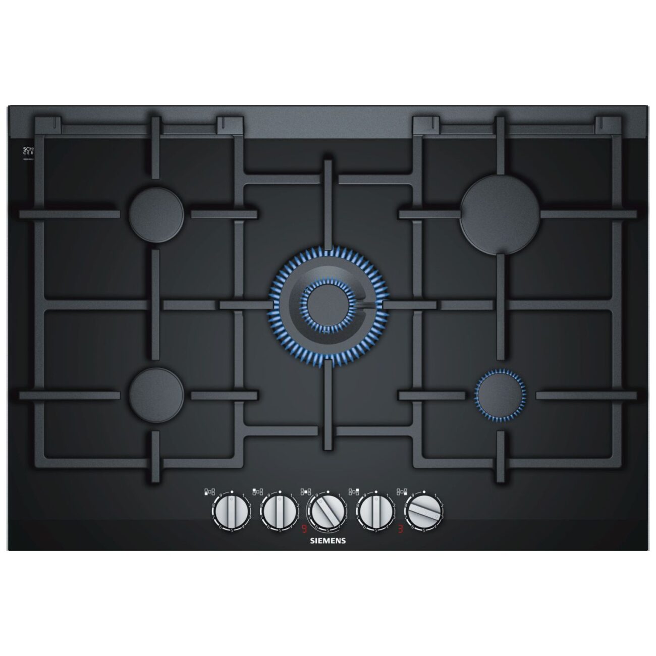 5 palników gazowych w tym 1 pod WOK, technologia stepFlame, wyświetlacz cyfrowy, zabezpieczenie przeciw-wypływowe, zapalarka, zapalarka, 2-częściowy żeliwny ruszt odporny na zmywanie w zmywarce, szer. 75 cm. Płyta obsługuje gazy: 2E, 3B/P.