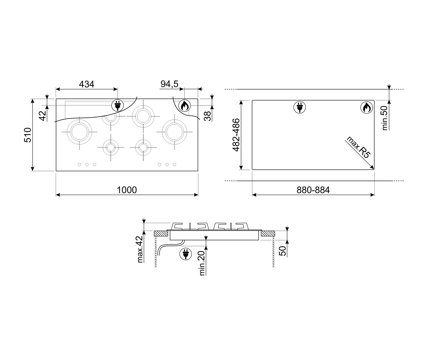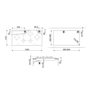 Płyta gazowa, szerokość: 100 cm, sterowanie za pomocą pokręteł, ruszty ze stali nierdzewnej z powłoką tytanową, 6 palników, automatyczny zapłon, zabezpieczenie przeciwwypływowe gazu