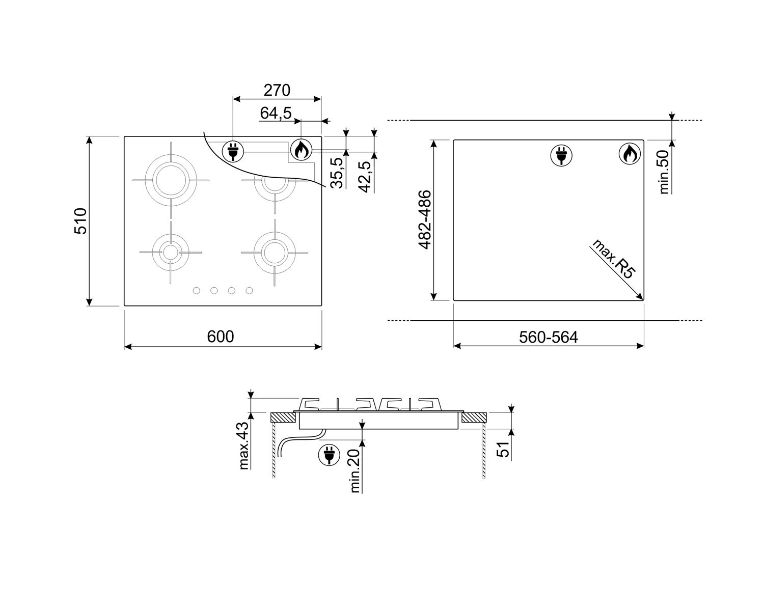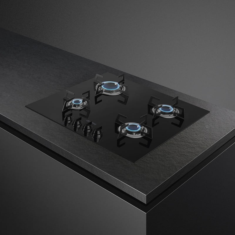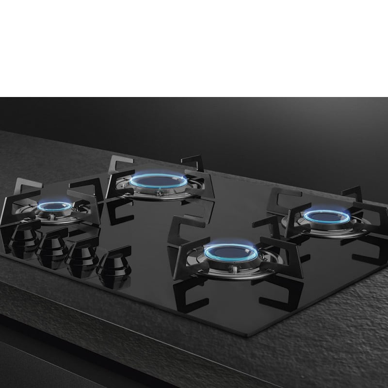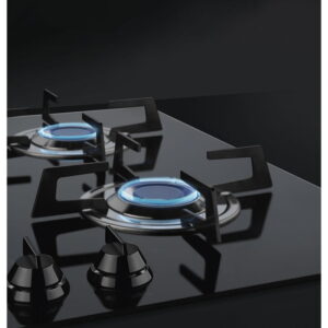 Płyta gazowa, szerokość: 60 cm, sterowanie za pomocą pokręteł, ruszty ze stali nierdzewnej z powłoką tytanową, 4 palniki, automatyczny zapłon, zabezpieczenie przeciwwypływowe gazu