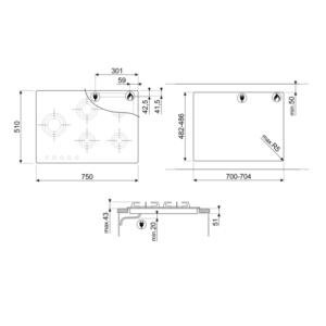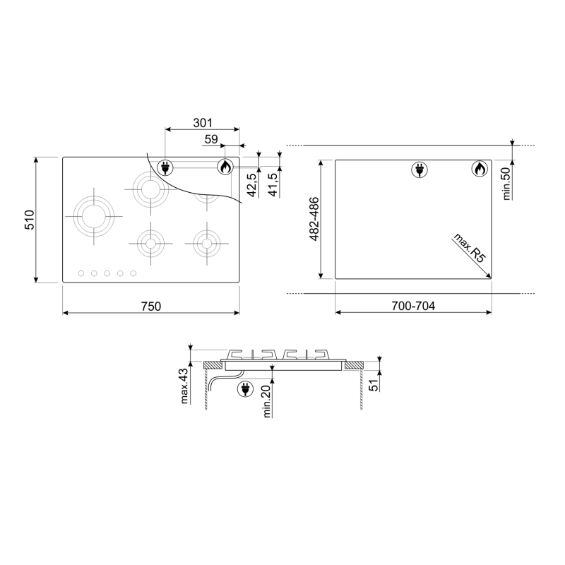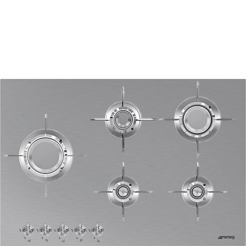 Płyta gazowa, szerokość: 75 cm, sterowanie za pomocą pokręteł, ruszty ze stali nierdzewnej z powłoką tytanową, 5 palników, automatyczny zapłon, zabezpieczenie przeciwwypływowe gazu