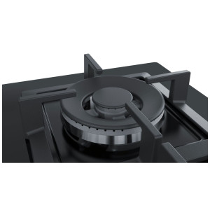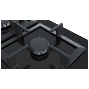 4 palniki gazowe w tym 1 podwójny palnik WOK, technologia stepFlame, płyta podpalnikowa ze szkła hartowanego, zabezpieczenie przeciwwypływowe gazu, zapalarka, 4 pojedyncze ruszty żeliwne. Płyta obsługuje gazy: 2E, 3B/P.