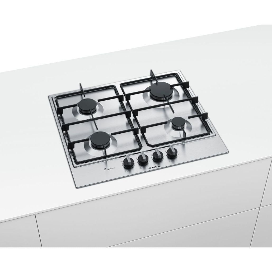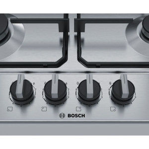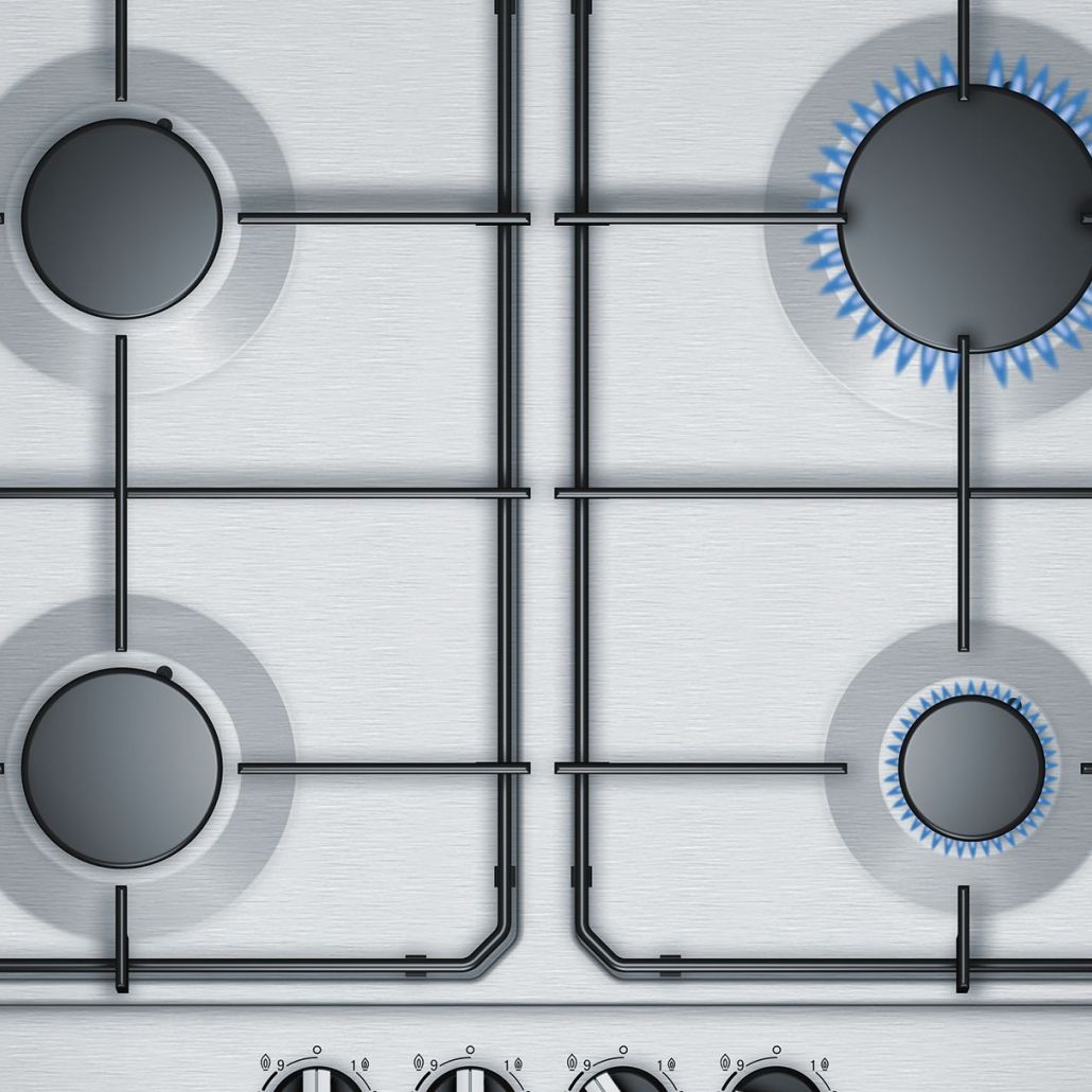4 palniki gazowe – 1 mocny, 2 standardowe, 1 oszczędny, technologia FlameSelect, zabezpieczenie przeciwwypływowe gazu, zapalarka, 2-częściowy emaliowany ruszt. Płyta obsługuje gazy: 2E, 3B/P.