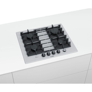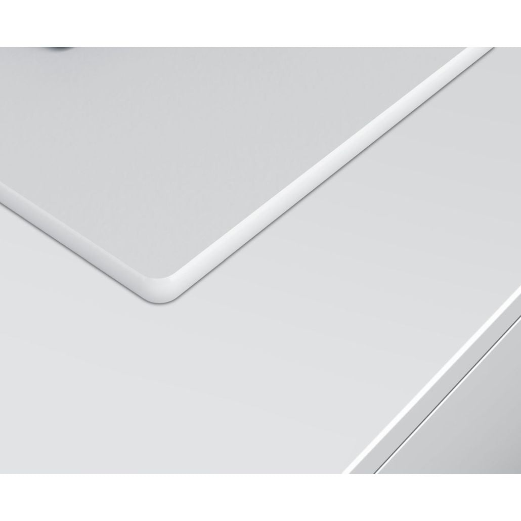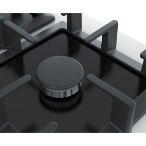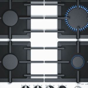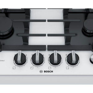 4 palniki gazowe – 1 mocny, 2 standardowe, 1 oszczędny, technologia FlameSelect, płyta podpalnikowa ze szkła hartowanego w kolorze białym, wyłącznik główny, zabezpieczenie przeciwwypływowe gazu, zapalarka, 4 pojedyncze ruszty żeliwne. Płyta obsługuje gazy: 2E.