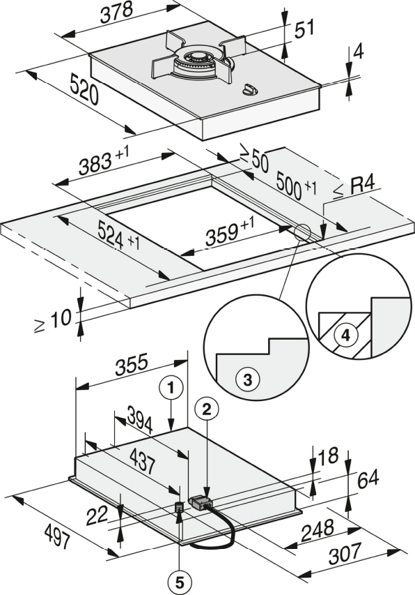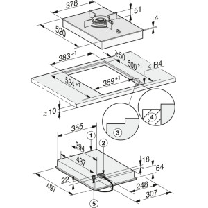 | Wewnętrzne wymiary wycięcia w mm (głębokość) przy wpasowaniu w blat |